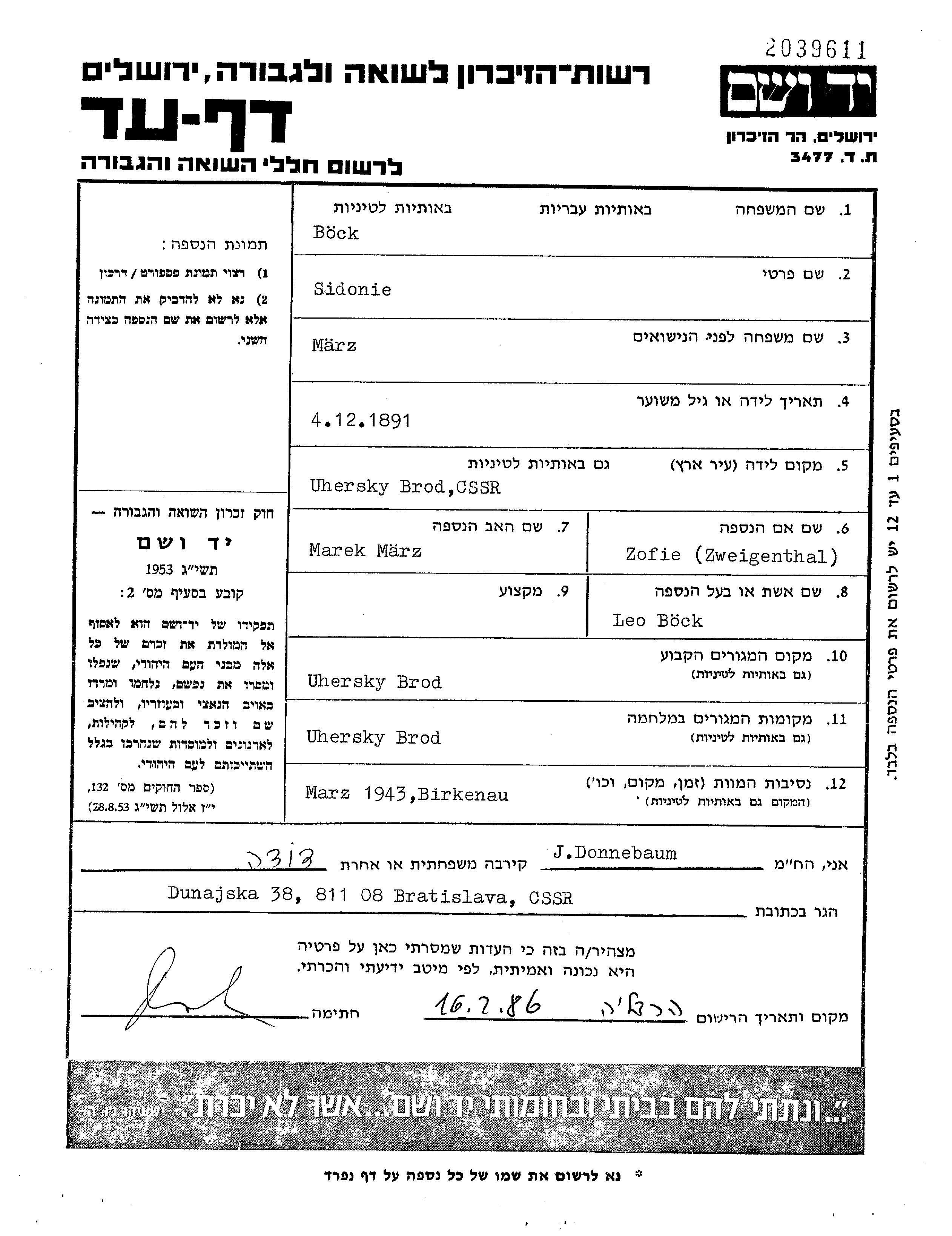 Sidonie Boeck Bek, geb. März wurde im Jahr 1891 in Uhersky Brod, Tschechoslowakei geboren. Sie war die Tochter von Marek und Zofie, geb. Zweigenthal. Sie war mit Leo Verheiratet. Vor dem Zweiten Weltkrieg lebte sie in Uhersky Brod, Tschechoslowakei. Während des Krieges war sie in Uhersky Brod, Tschechoslowakei.