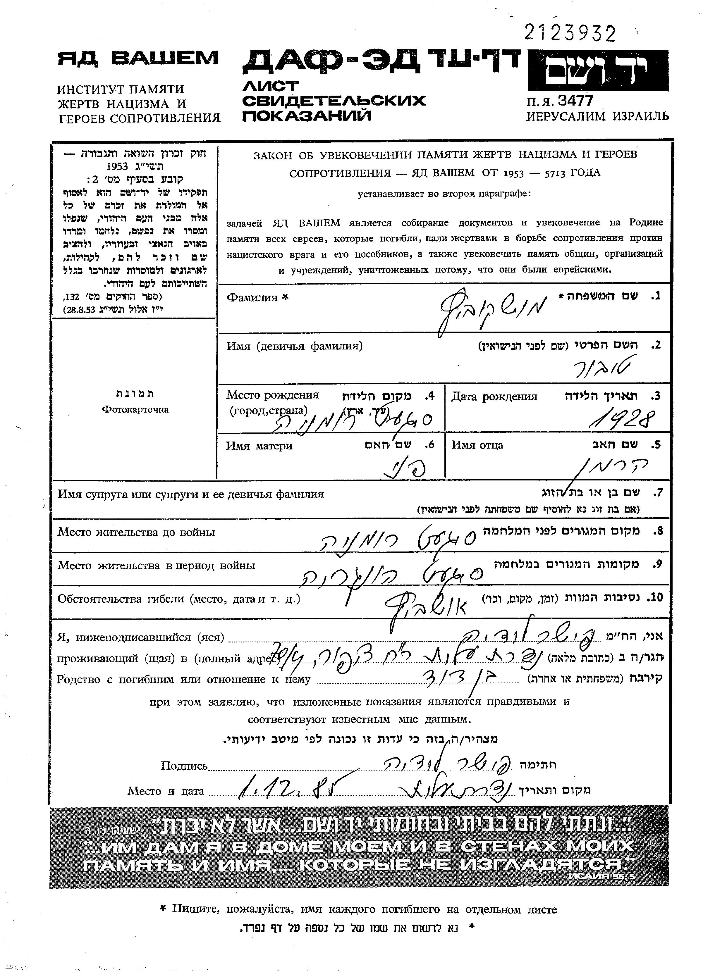 Moskovitz Tibor 1928 Sighet, Rumänien Gedenkblatt