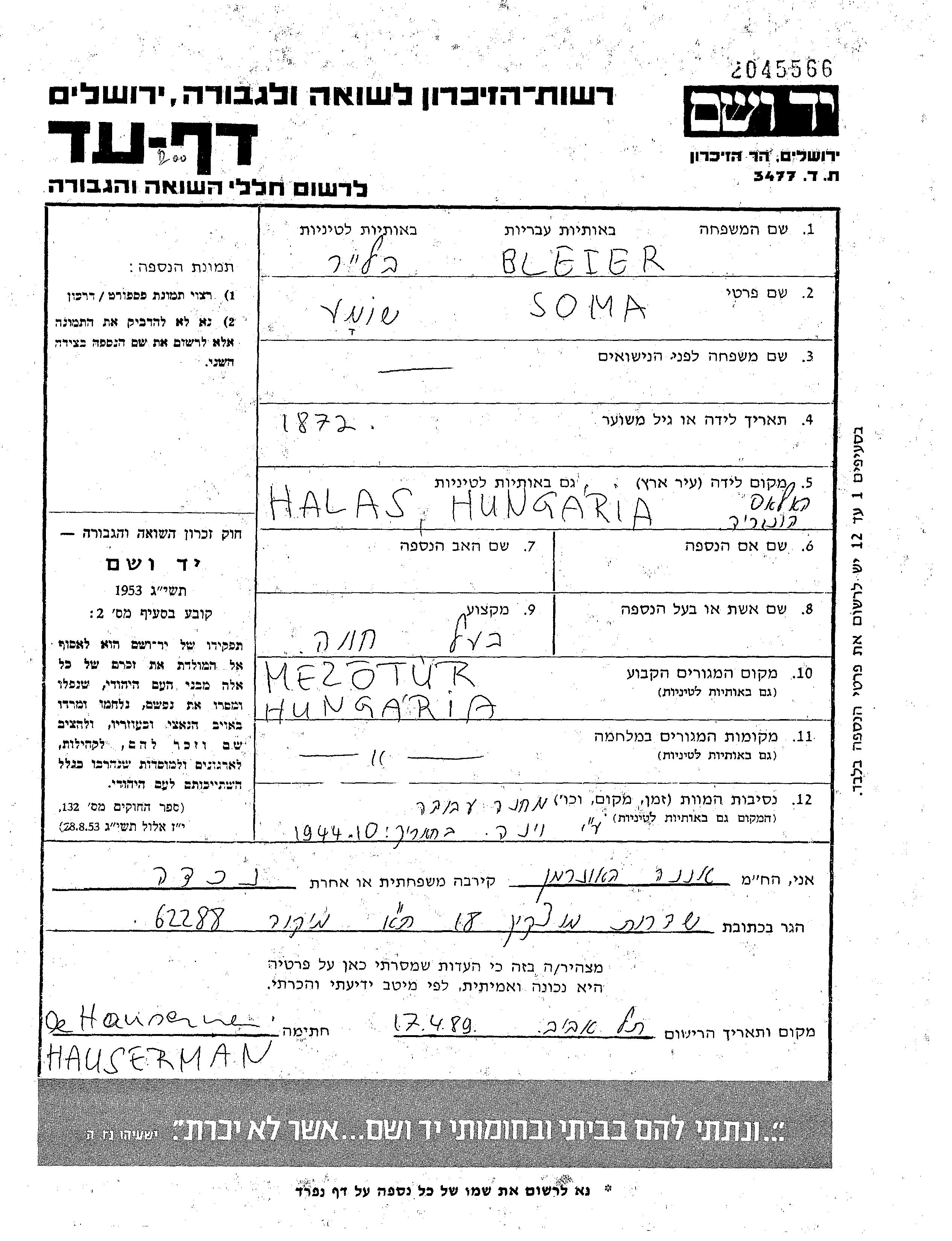 Soma Shoma Bleier wurde im Jahr 1872 in Halaszi, Ungarn geboren. Er war Gutsbesitzer. Vor dem Zweiten Weltkrieg lebte er in Mezotur, Ungarn. Während des Krieges war er in Mezotur, Ungarn.