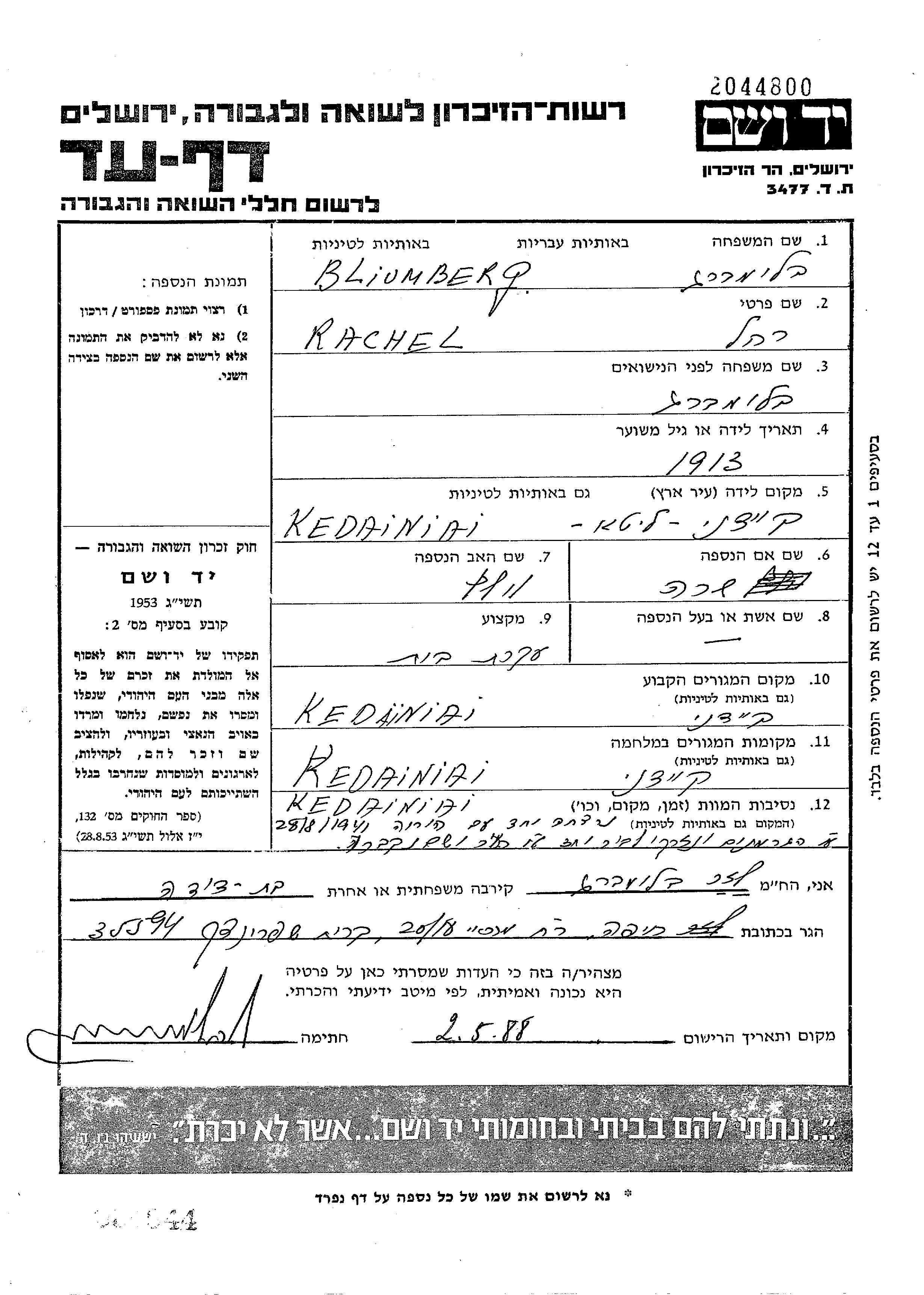 Rachel Bliumberg wurde im Jahr 1913 in Kedainiai, Litauen geboren. Sie war die Tochter von Vulfe Zeev und Sara. Sie war Hausfrau. Vor dem Zweiten Weltkrieg lebte sie in Kedainiai, Litauen. Während des Krieges war sie in Kedainiai, Litauen.