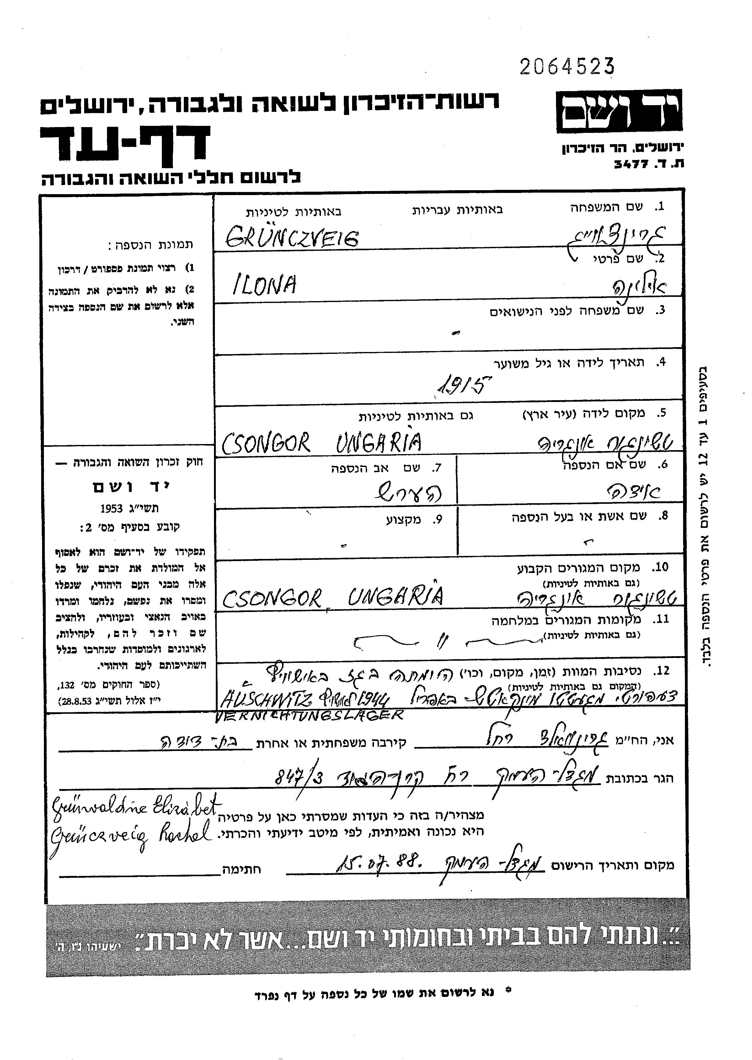 Ilona Gruenczveig wurde im Jahr 1915 in Csongor, Tschechoslowakei geboren. Sie war die Tochter von Hersh und Ida, geb. Weisz. Vor dem Zweiten Weltkrieg lebte sie in Csongor, Tschechoslowakei. Während des Krieges war sie in Munkacs, Tschechoslowakei.
