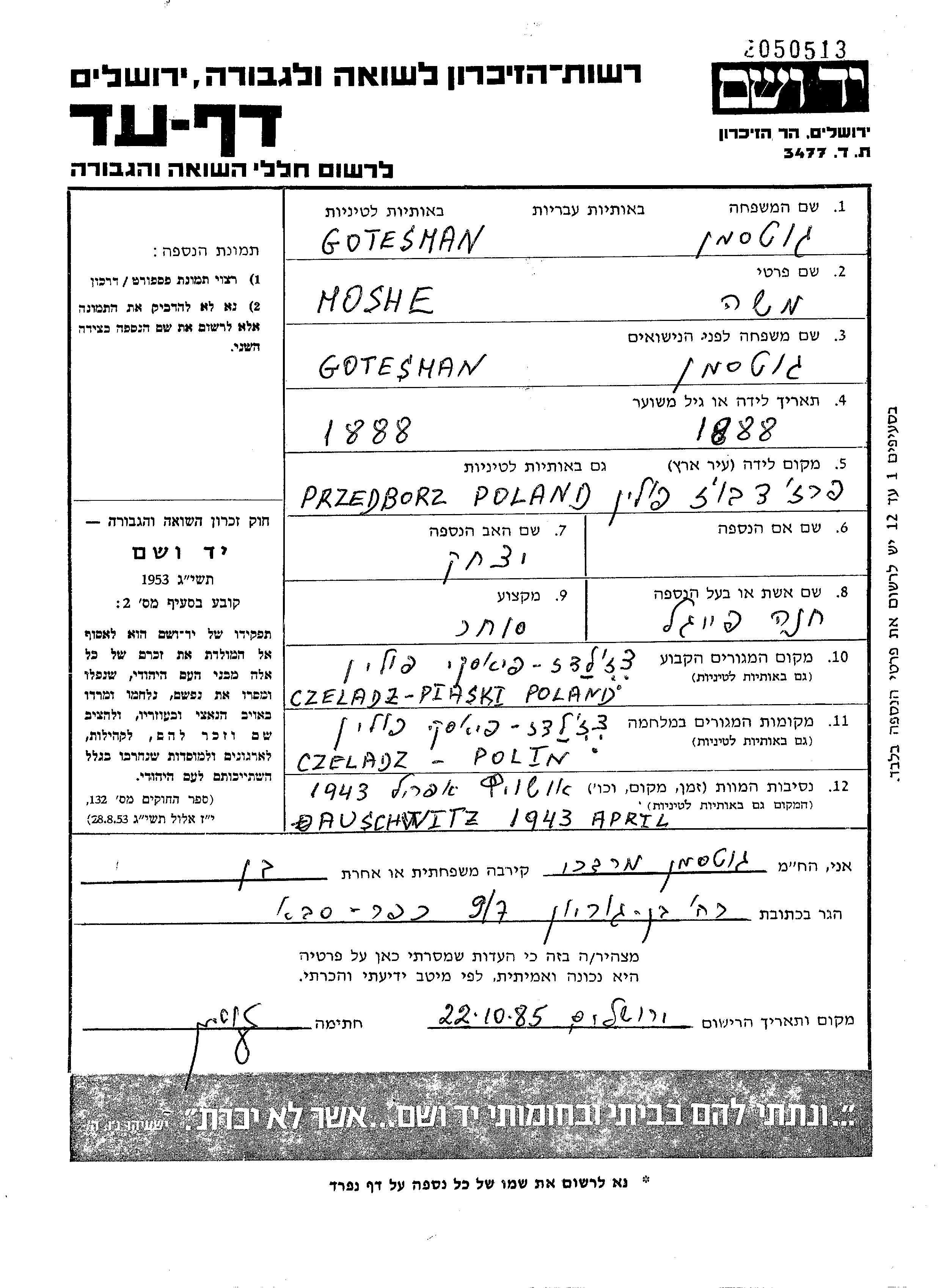 Moshe Gotesman wurde im Jahr 1888 in Przedborz, Polen geboren. Er war der Sohn von Ytzkhak. Er war Kaufmann/-frau und mit Chana Faigel Verheiratet. Vor dem Zweiten Weltkrieg lebte er in Czeladz, Polen. Während des Krieges war er in Czeladz, Polen.
