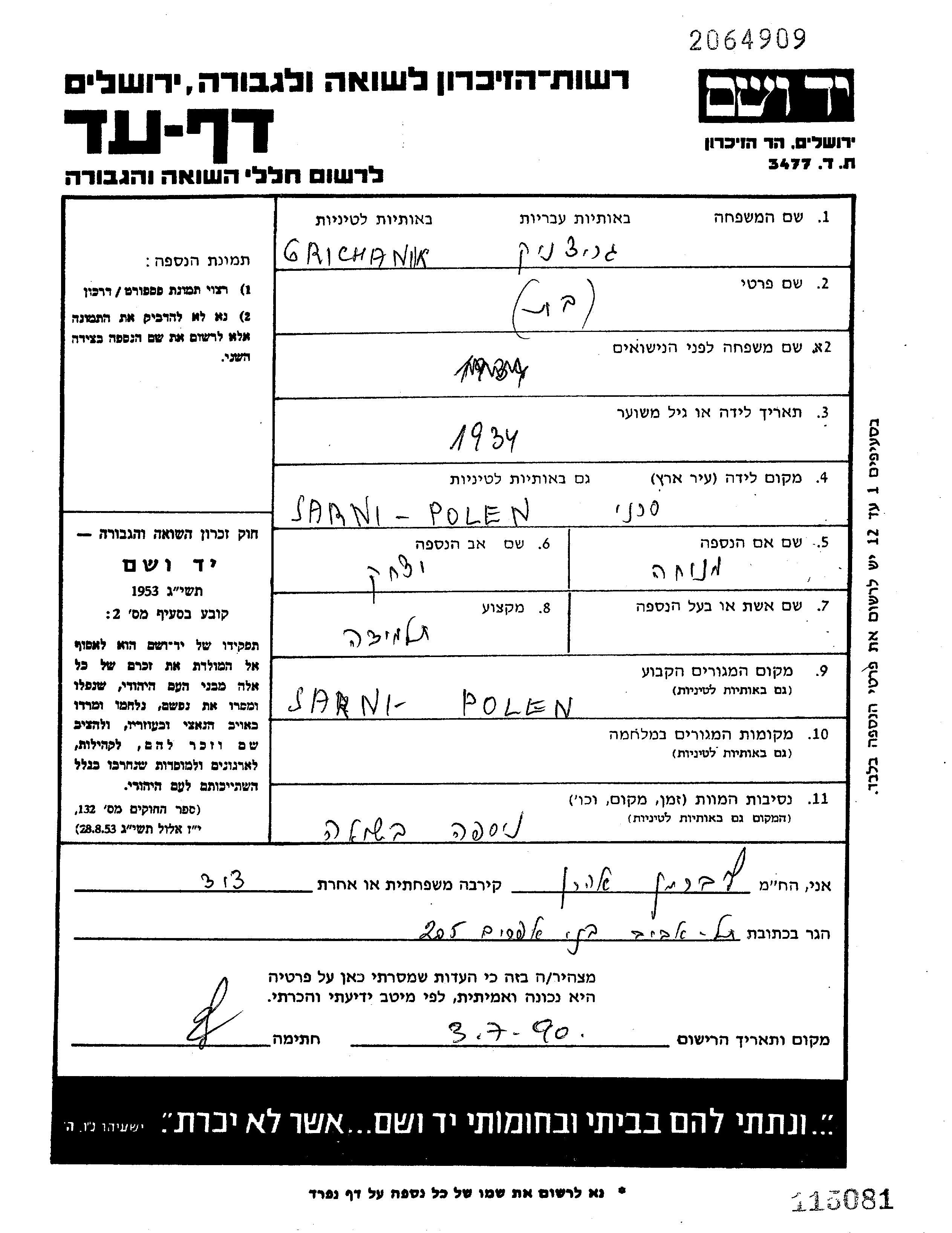 Vorname unbekannt Grichanik wurde im Jahr 1934 in Sarny, Polen geboren. Sie war die Tochter von Ytzkhak und Menukha. Sie war Schüler/-in und Kind. Vor dem Zweiten Weltkrieg lebte sie in Sarny, Polen.