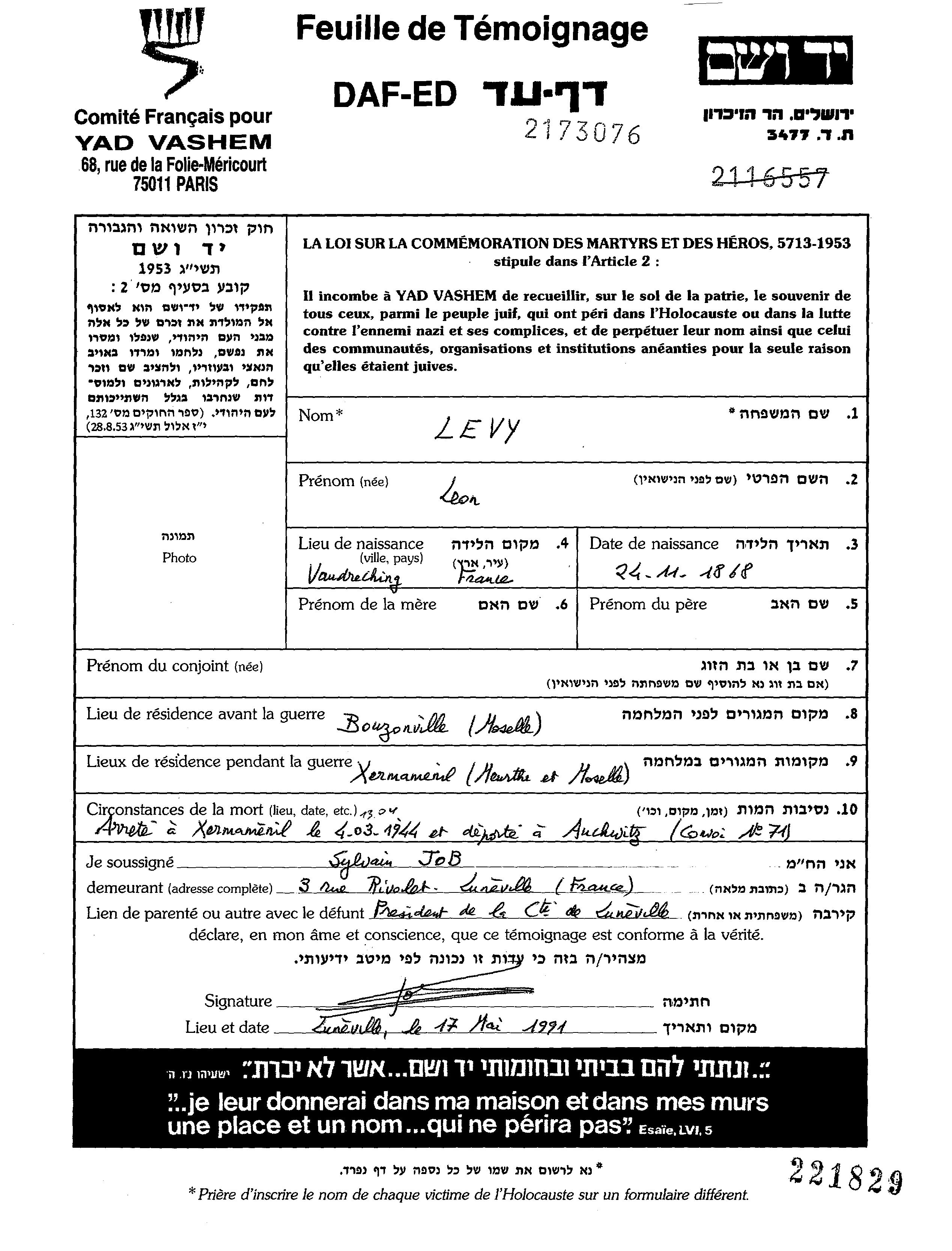 Leon Levy wurde im Jahr 1868 in Vaudreching, Frankreich geboren. Vor dem Zweiten Weltkrieg lebte er in Bouzonville, Frankreich. Während des Krieges war er in Xermamenil, Frankreich.