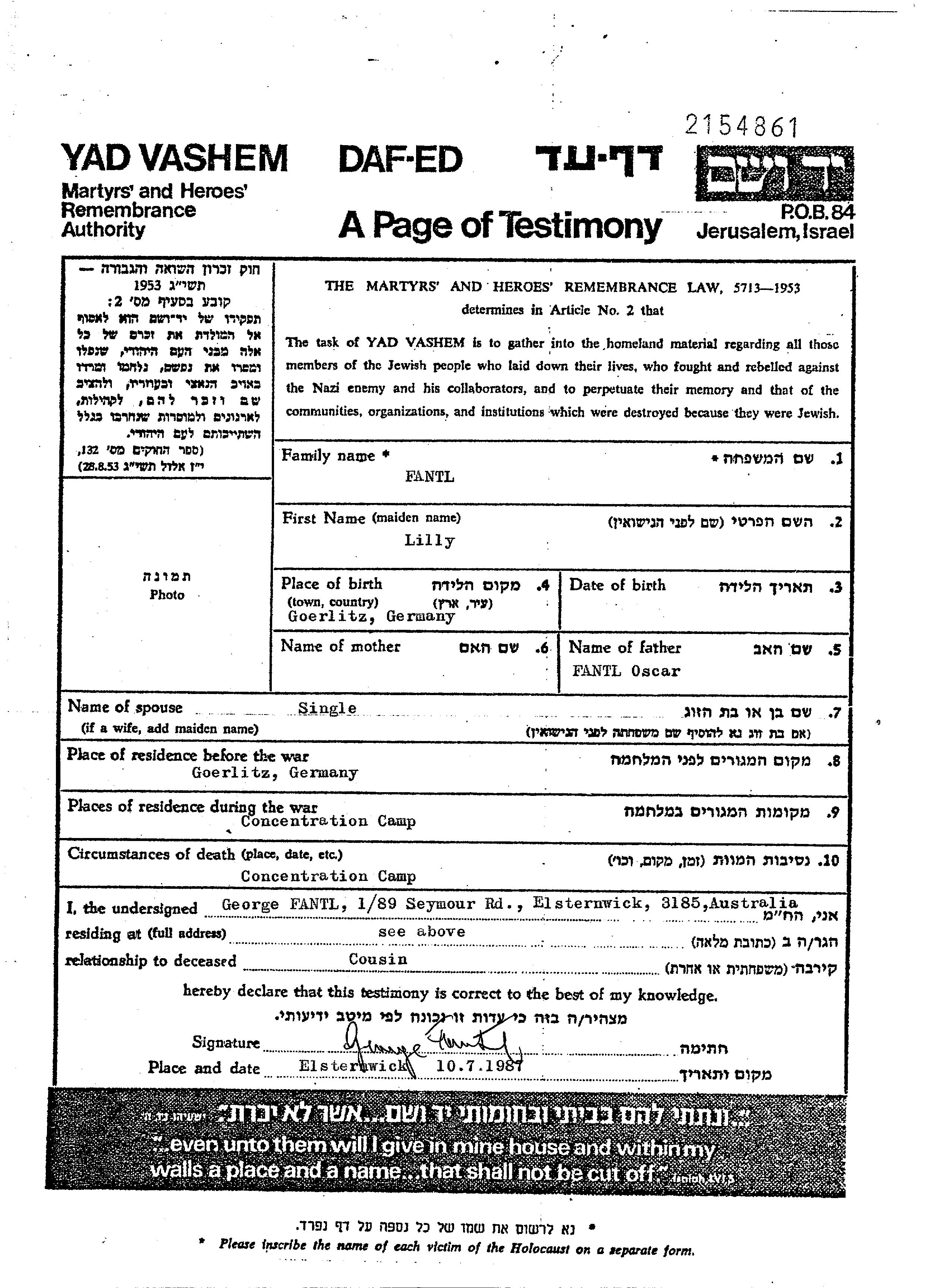 Lilly Fantl wurde in Goerlitz, Deutsches Reich geboren. Sie war die Tochter von Oscar. Sie war Ledig. Vor dem Zweiten Weltkrieg lebte sie in Goerlitz, Deutsches Reich.