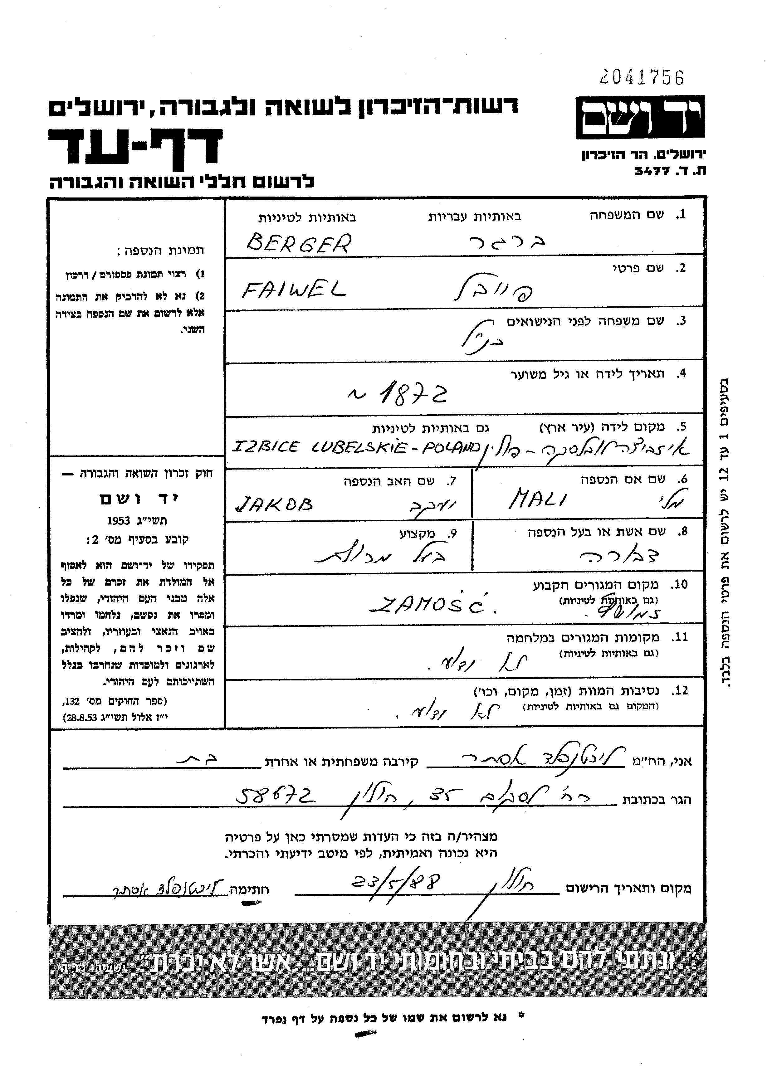 Faiwel Berger wurde im Jahr 1872 in Izbica Lubelski, Polen geboren. Er war der Sohn von Jakob und Mali Mali. Er war Besitzer/-in eines lebensmittelgeschäfts und mit Dvora Verheiratet. Vor dem Zweiten Weltkrieg lebte er in Zamosc, Polen.