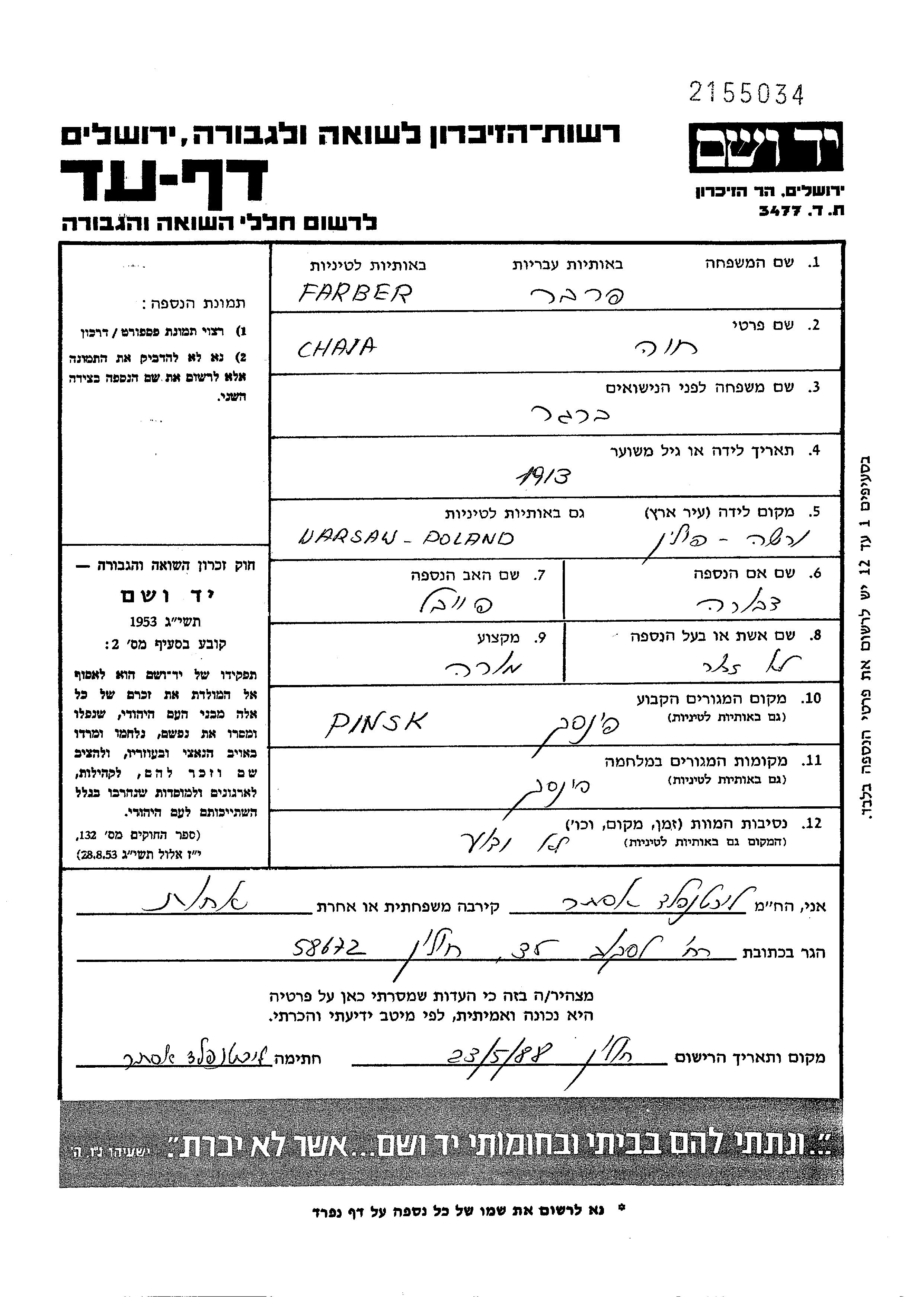 Chaja Farber, geb. Berger wurde im Jahr 1913 in Warszawa, Polen geboren. Sie war die Tochter von Faivel und Dvora. Sie war Lehrer/in und Verheiratet. Vor dem Zweiten Weltkrieg lebte sie in Pinsk, Polen. Während des Krieges war sie in Pinsk, Polen.