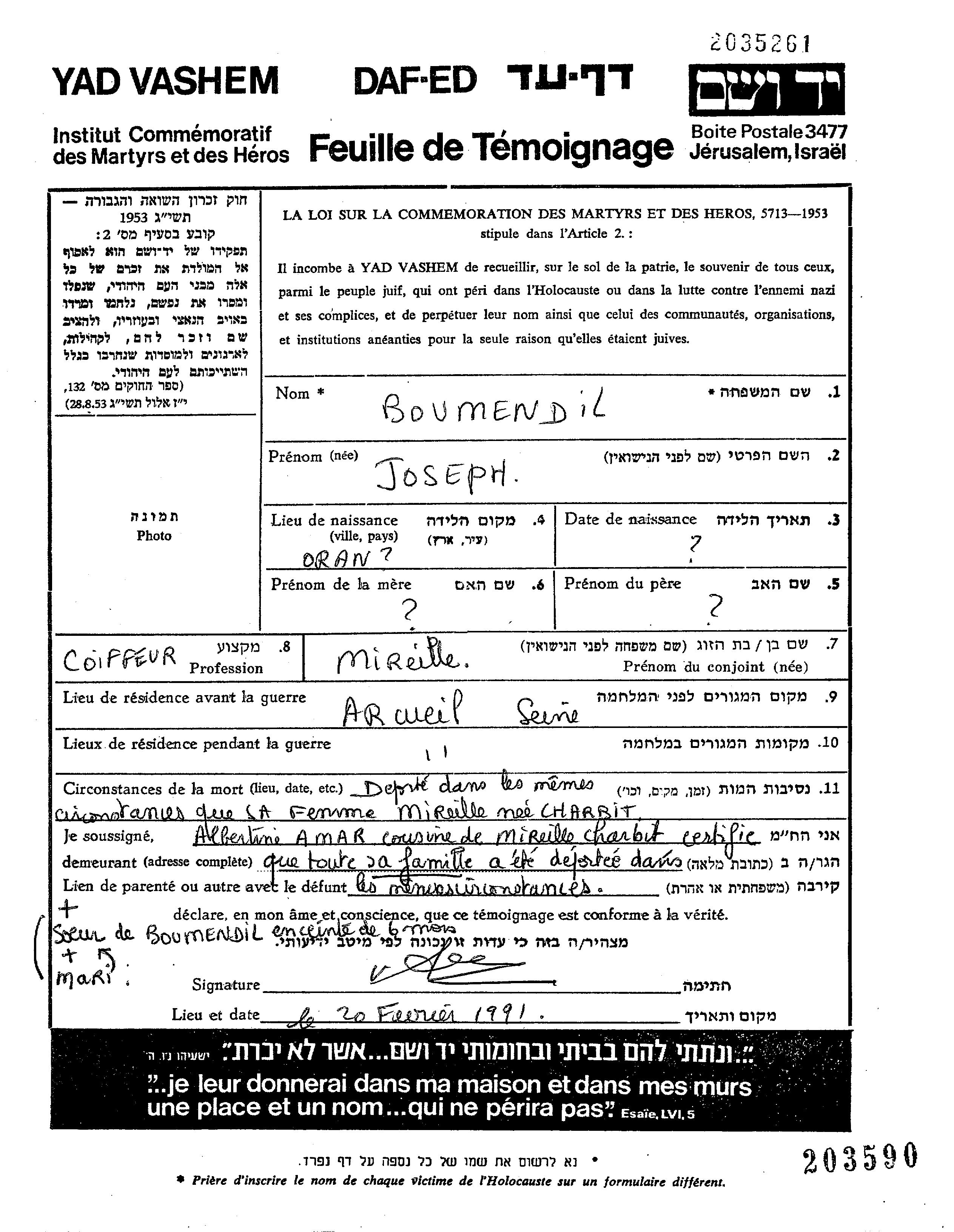 Joseph Georges Boumendil. Er war Friseur/-in und mit Mireille Verheiratet. Vor dem Zweiten Weltkrieg lebte er in Arcueil, Frankreich. Während des Krieges war er in Arcueil, Frankreich.