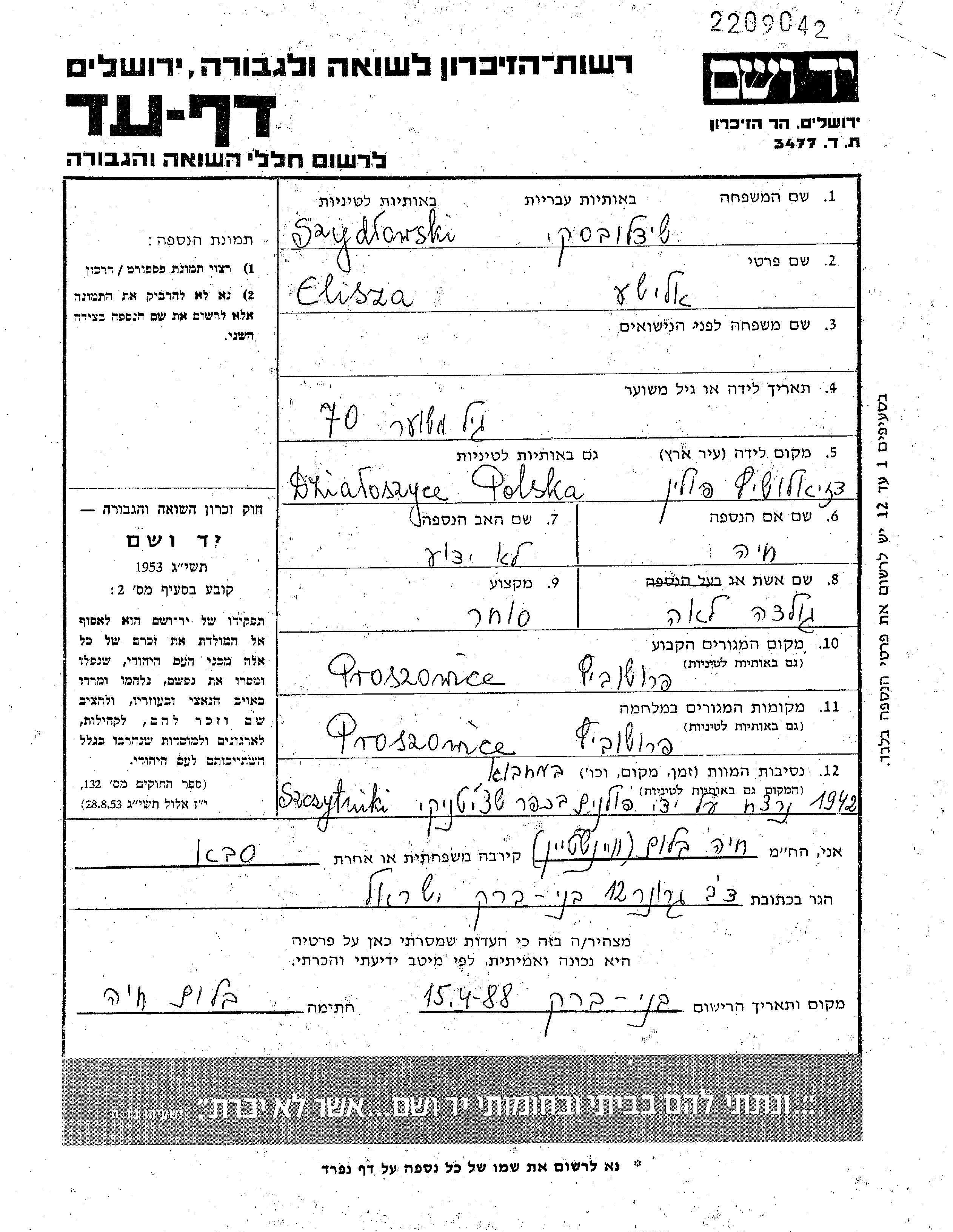 Elisza Szydlowski wurde in Dzialoszyce, Polen geboren. Er war der Sohn von Khaia. Er war Kaufmann/-frau und mit Golda Lea Verheiratet. Vor dem Zweiten Weltkrieg lebte er in Proszowice, Polen. Während des Krieges war er in Proszowice, Polen.