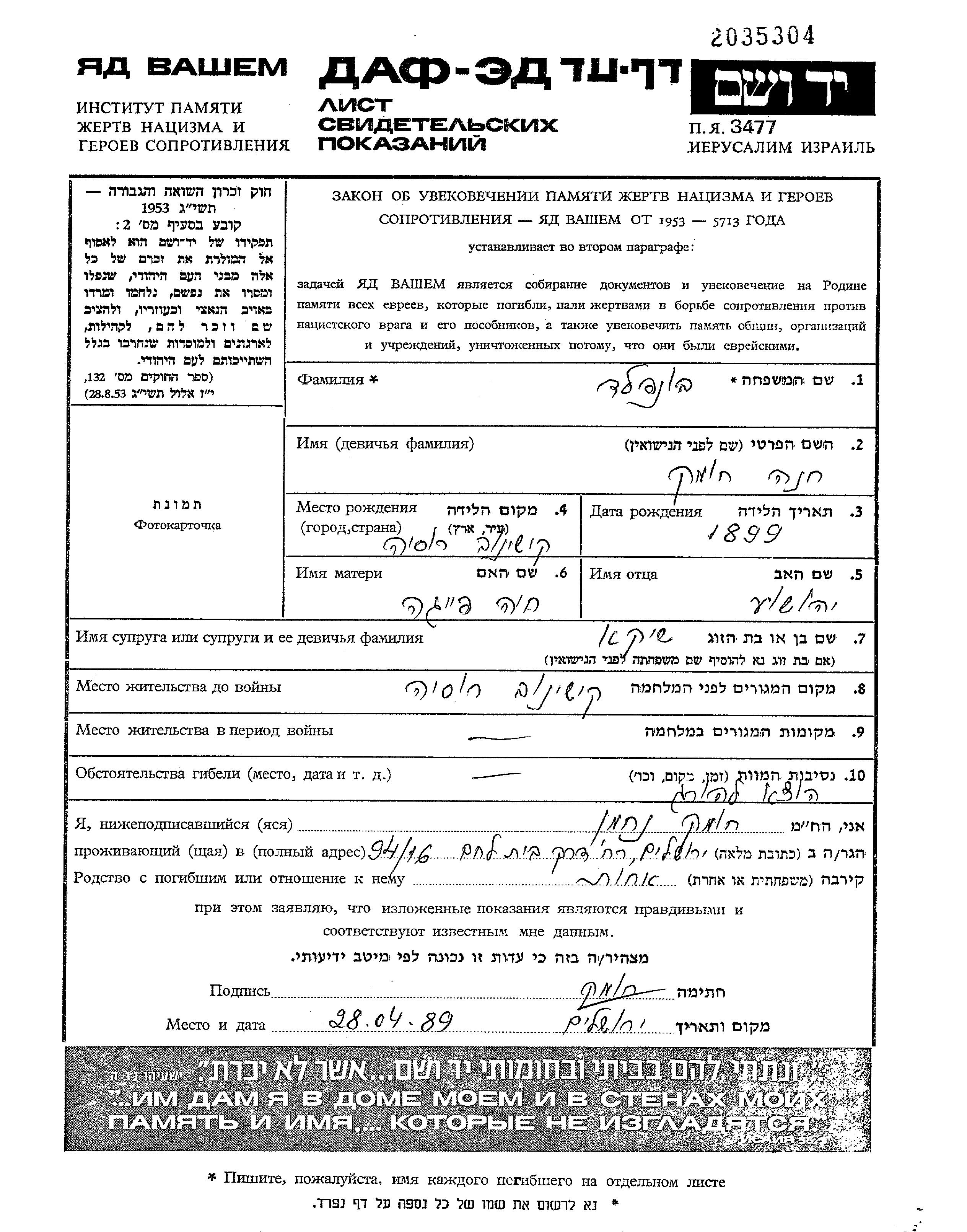 Khana Bunfeld, geb. Khomak wurde im Jahr 1899 in Kishinev, Rumänien geboren. Sie war die Tochter von Yehoshua und Khaia Feiga. Sie war mit Shika Verheiratet. Vor dem Zweiten Weltkrieg lebte sie in Kishinev, Rumänien.