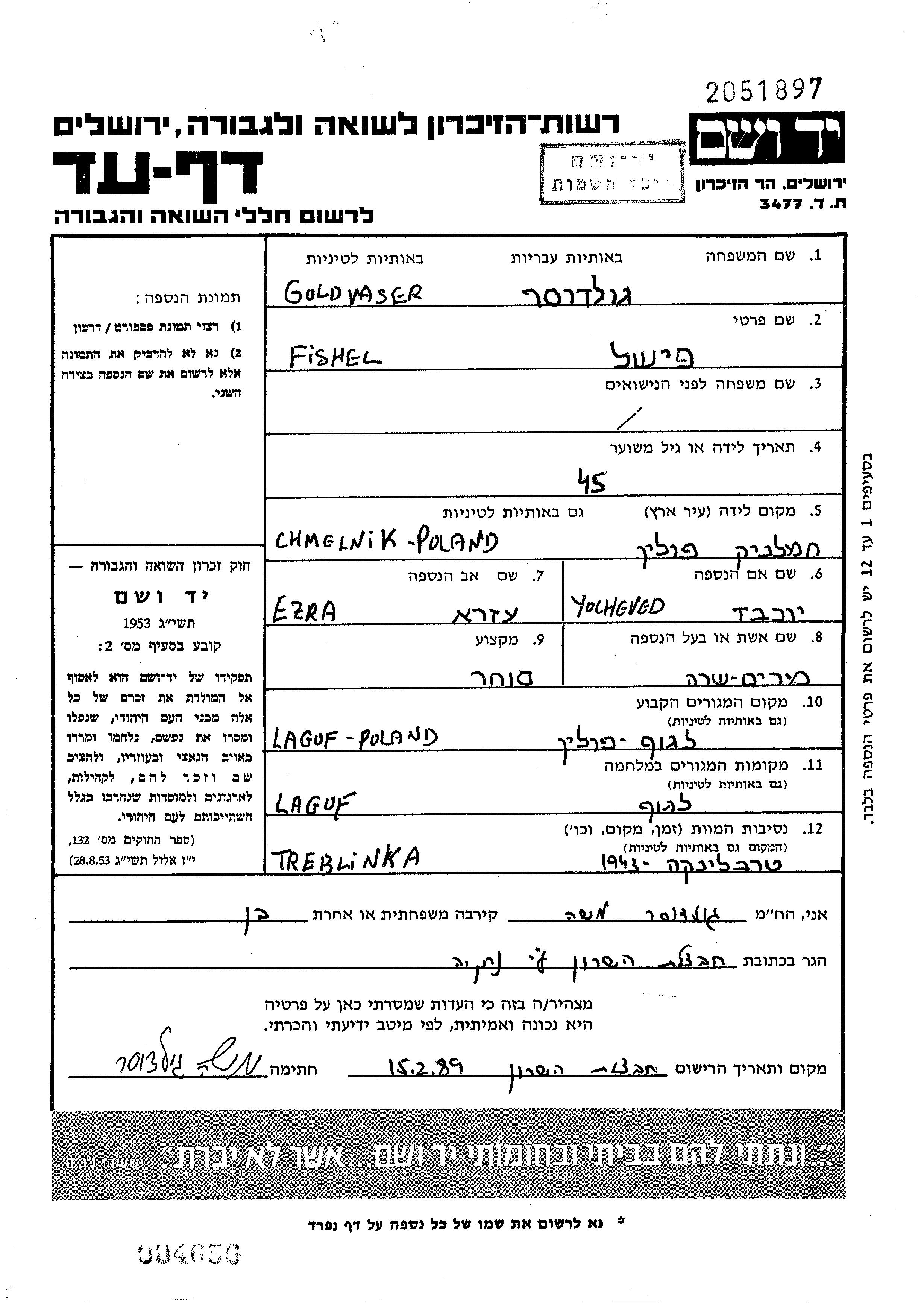 Fishel wurde in der Schoah ermordet. Todesort: Treblinka, Polen im Jahr 1943.
