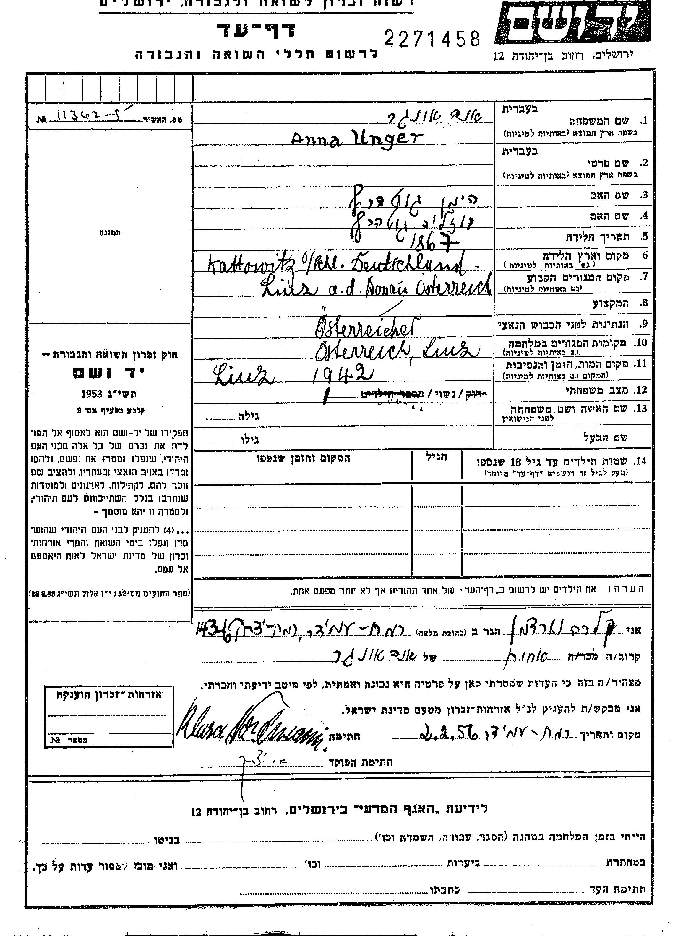 Anna Unger, geb. Guthertz wurde im Jahr 1867 in Kattowitz, Polen geboren. Sie war die Tochter von Heiman und Rozalia. Sie war Verheiratet. Vor dem Zweiten Weltkrieg lebte sie in Linz am Donau, Österreich. Während des Krieges war sie in Linz am Donau, Österreich.