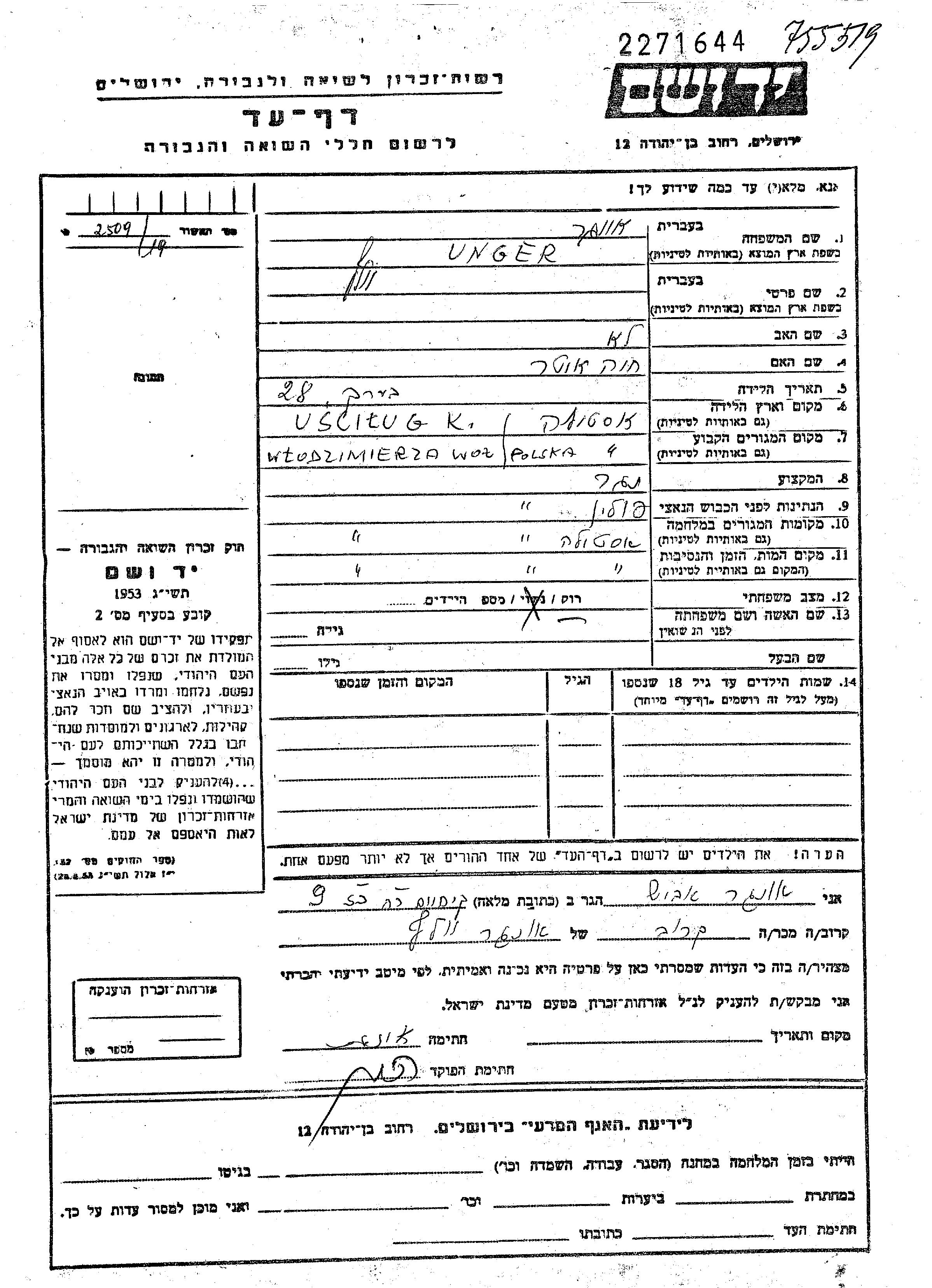 Volf Unger wurde in Uscilug, Polen geboren. Er war der Sohn von Khaia Ita. Er war Zimmermann und Ledig. Vor dem Zweiten Weltkrieg lebte er in Wlodzimierz Wolynski, Polen. Während des Krieges war er in Uscilug, Polen.