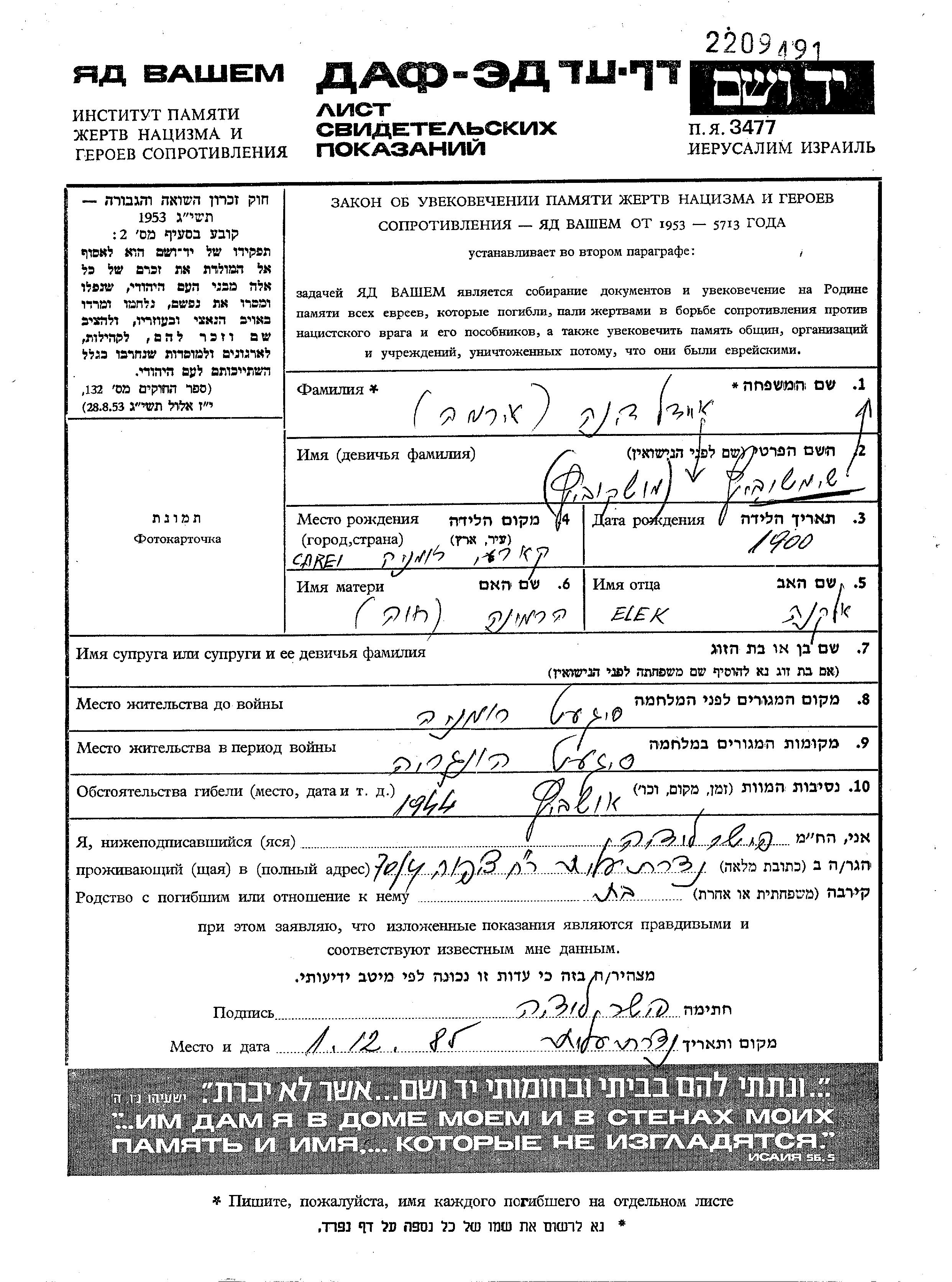 Eidel Dina Irma Shimshovitz, geb. Moshkovich wurde in Carei Mare, Rumänien geboren. Sie war die Tochter von Alek Elkana und Khava Hermina. Sie war mit Israel Verheiratet. Vor dem Zweiten Weltkrieg lebte sie in Sighet, Rumänien. Während des Krieges war sie in Sighet, Rumänien.