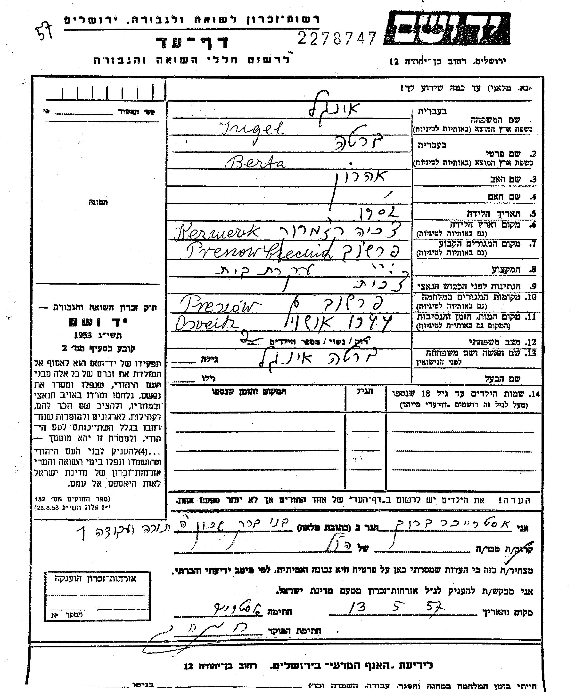 Berta Ingel wurde im Jahr 1902 in Kesmark, Tschechoslowakei geboren. Sie war die Tochter von Ahron. Sie war Hausfrau und Verheiratet. Vor dem Zweiten Weltkrieg lebte sie in Presov, Tschechoslowakei. Während des Krieges war sie in Presov, Tschechoslowakei.