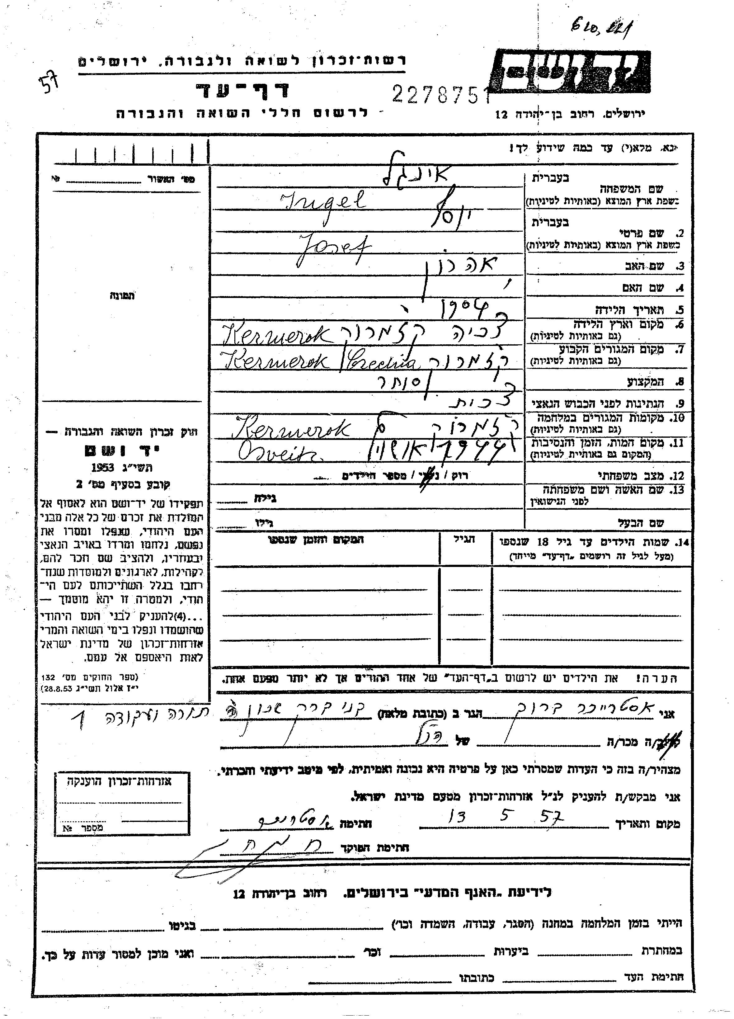 Josef Ingel wurde im Jahr 1904 in Kesmark, Tschechoslowakei geboren. Er war der Sohn von Ahron. Er war Kaufmann/-frau und Ledig. Vor dem Zweiten Weltkrieg lebte er in Kesmark, Tschechoslowakei. Während des Krieges war er in Kesmark, Tschechoslowakei.