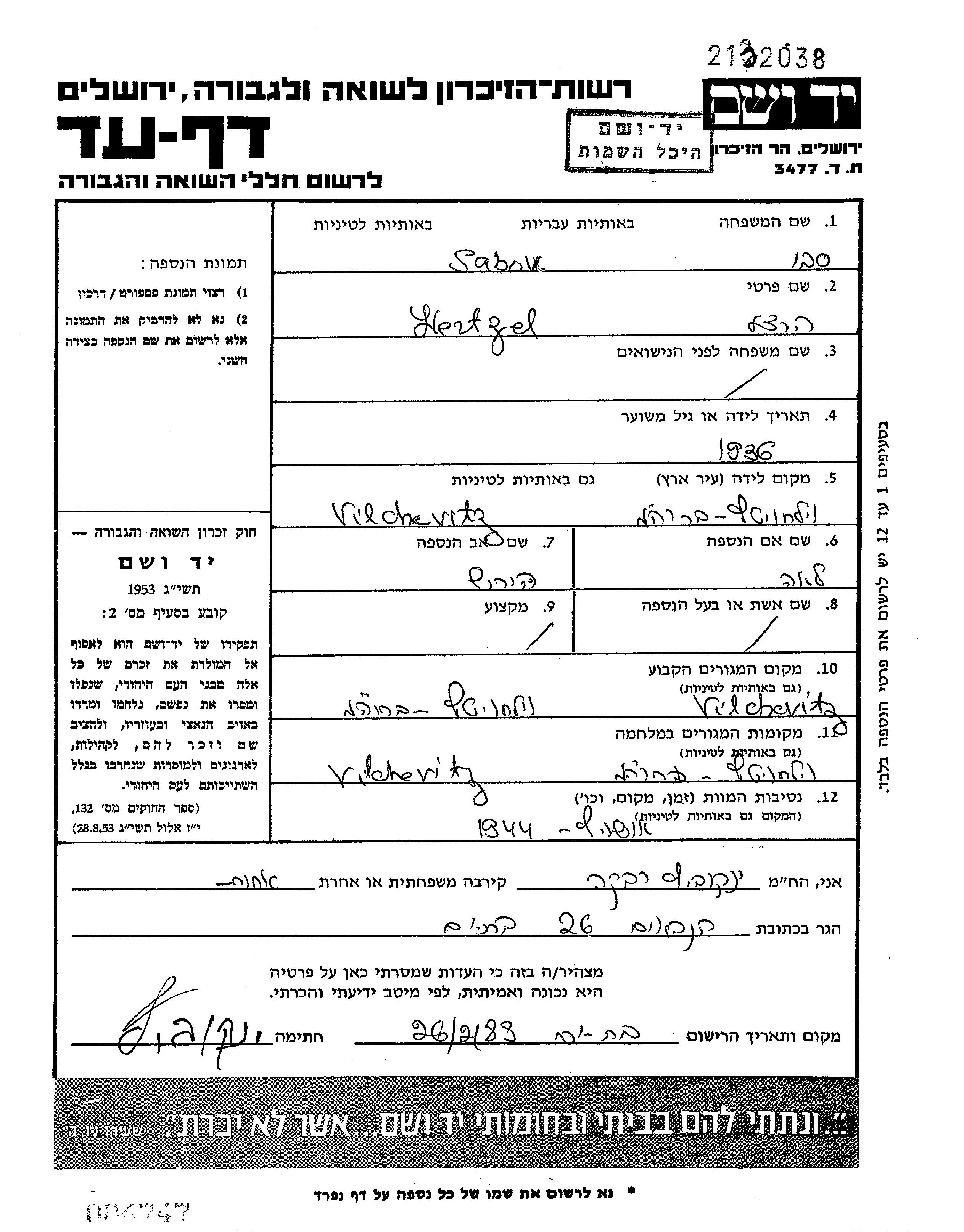 Hertzel Sabov Sabo wurde in Vilhovitz, Tschechoslowakei geboren. Er war der Sohn von Hirsh und Lea. Er war Kind. Vor dem Zweiten Weltkrieg lebte er in Vilhovitz, Tschechoslowakei. Während des Krieges war er in Vilhovitz, Tschechoslowakei.