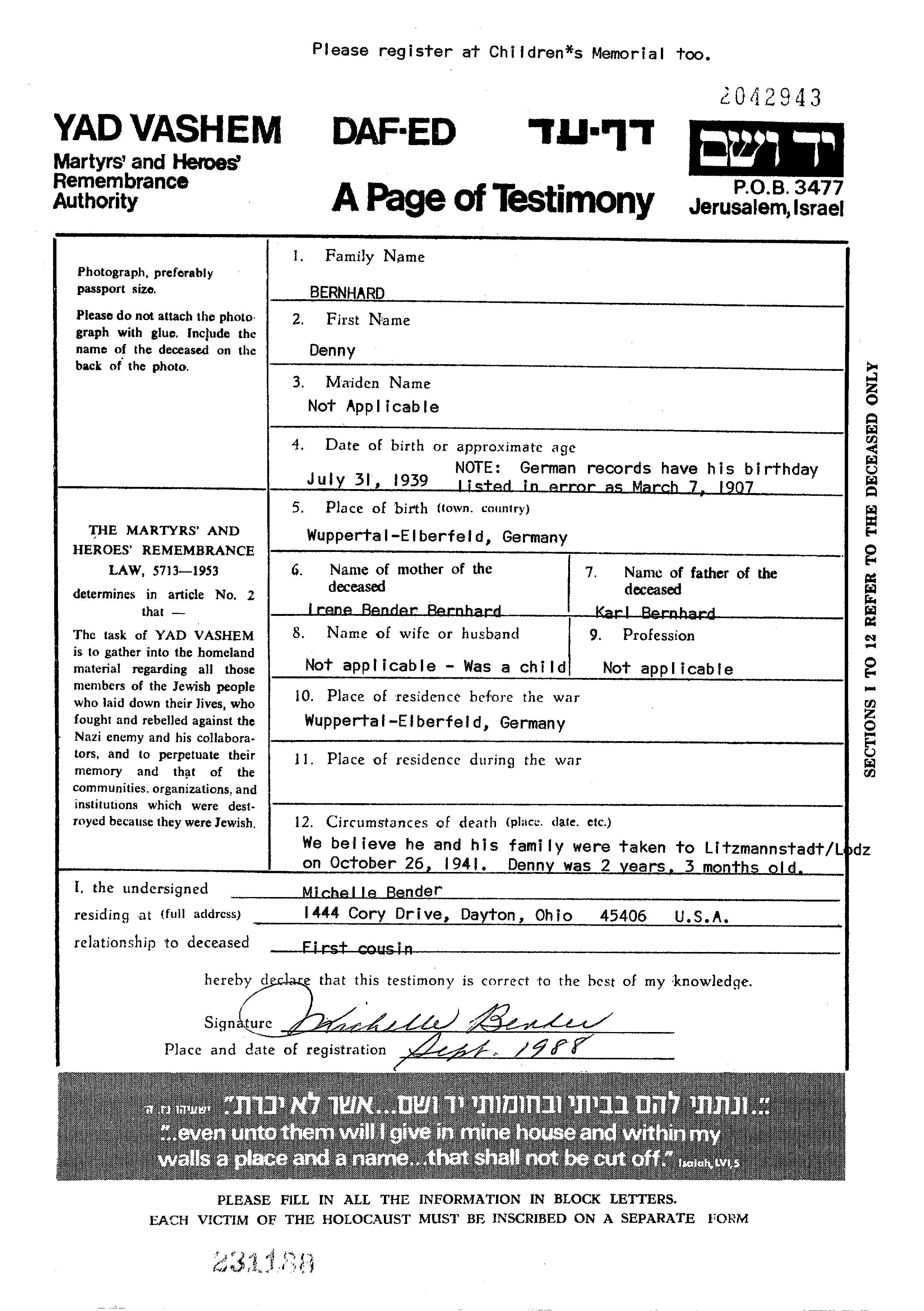 Dani Denny Bernhard wurde im Jahr 1939 in Wuppertal, Deutsches Reich geboren. Er/sie war der/ die Sohn/Tochter von Karl und Irene, geb. Bender. Er/Sie war Kind. Vor dem Zweiten Weltkrieg er/sie in Wuppertal, Deutsches Reich.