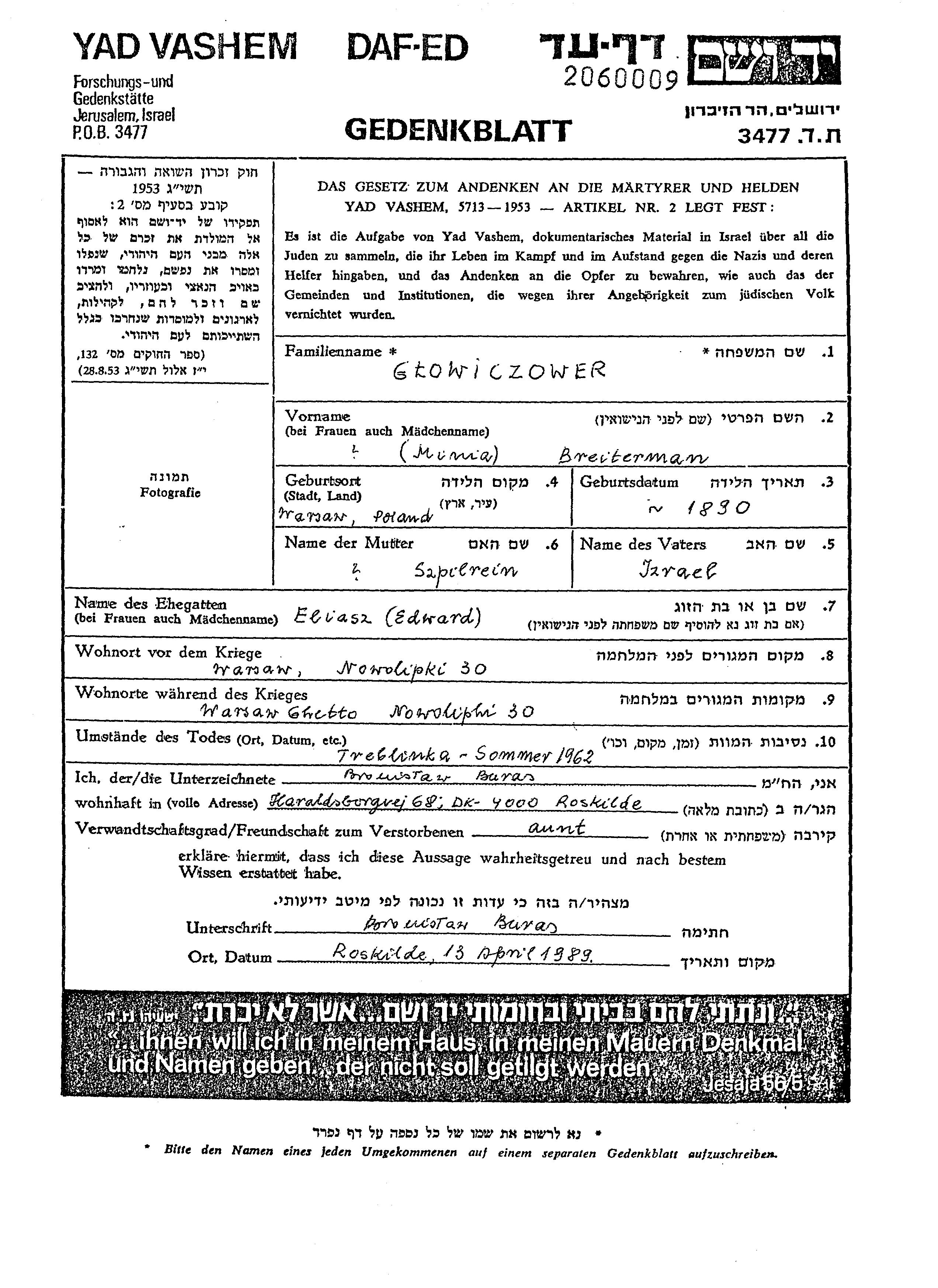 Minia Glowiczower, geb. Breiterman wurde im Jahr 1890 in Warszawa, Polen geboren. Sie war die Tochter von Izrael, geb. Szpilrein. Sie war mit Eliasz Edward Verheiratet. Vor dem Zweiten Weltkrieg lebte sie in Warszawa, Polen. Während des Krieges war sie in Warszawa, Polen.
