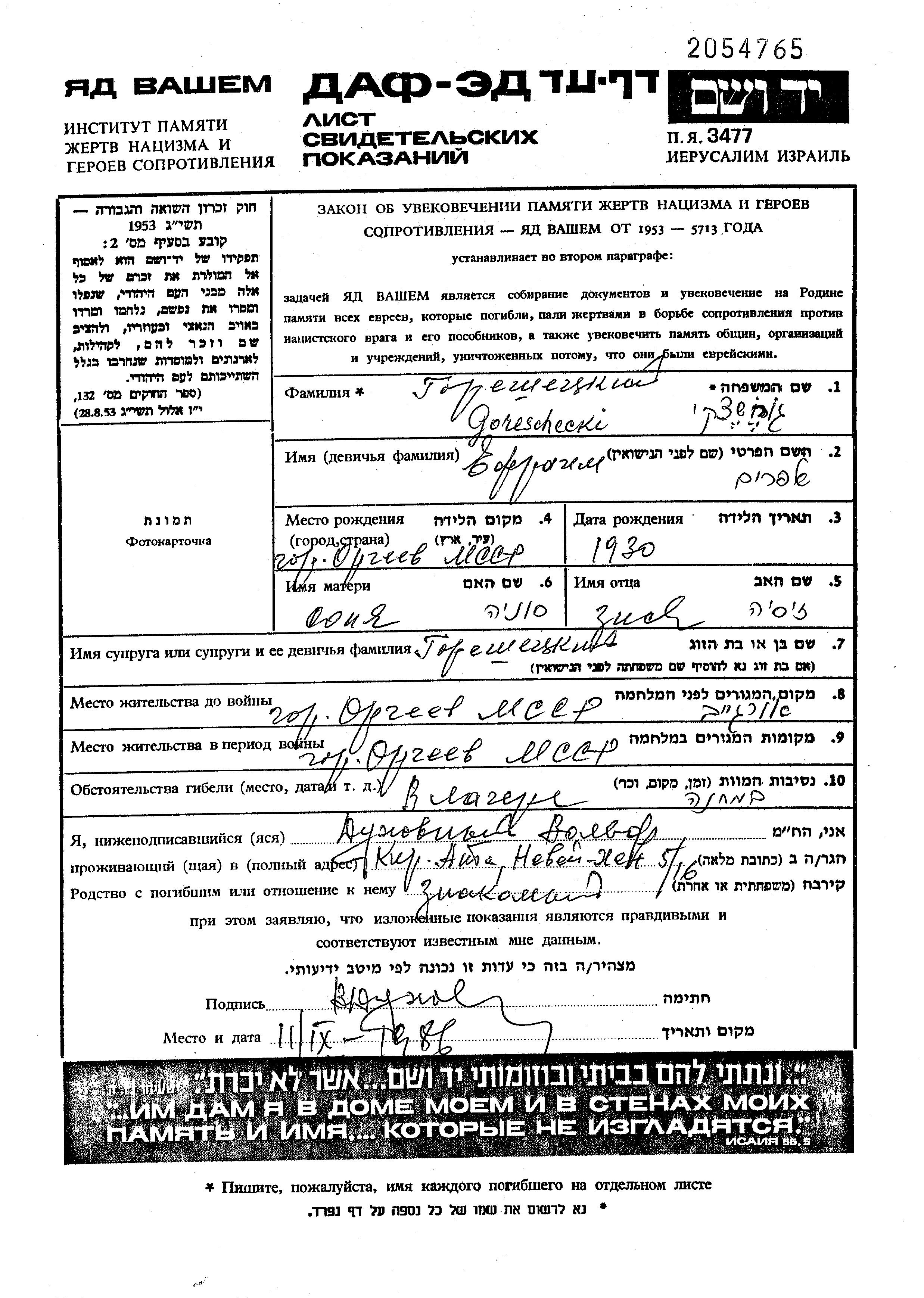 Yefraim Goreshetzki wurde in Orhei, Rumänien geboren. Er war der Sohn von Zisia und Sonia, geb. Ikhilevich. Er war Kind. Vor dem Zweiten Weltkrieg lebte er in Orhei, Rumänien. Während des Krieges war er in Orhei, Rumänien.