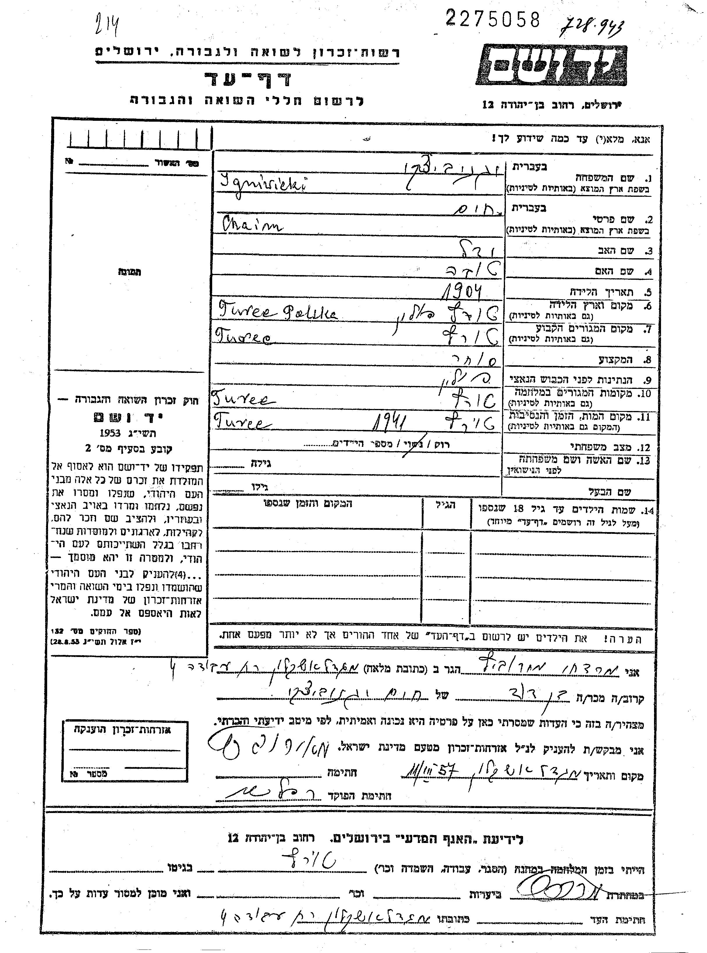 Chaim Igniwicki wurde im Jahr 1904 in Turetz, Polen geboren. Er war der Sohn von Judko Iudka und Tova, geb. Aronovitz. Er war Kaufmann/-frau und Ledig. Vor dem Zweiten Weltkrieg lebte er in Turetz, Polen. Während des Krieges war er in Turetz, Polen.