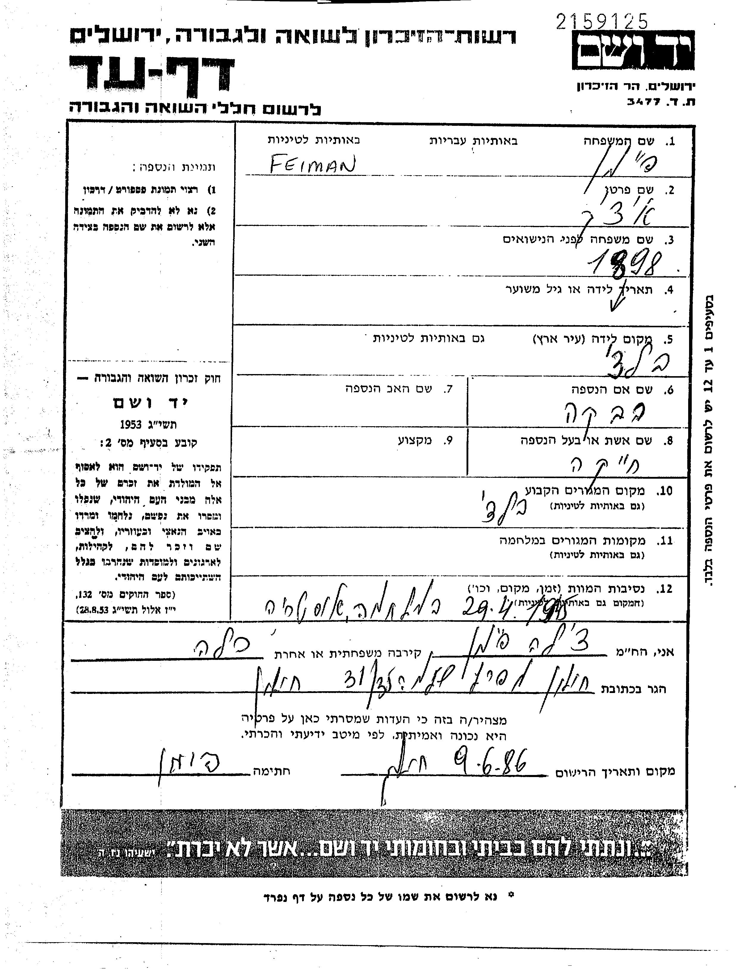 Itzik Feiman wurde im Jahr 1898 in Balti, Rumänien geboren. Er war der Sohn von Rivka. Er war mit Khaika Verheiratet. Vor dem Zweiten Weltkrieg lebte er in Balti, Rumänien.