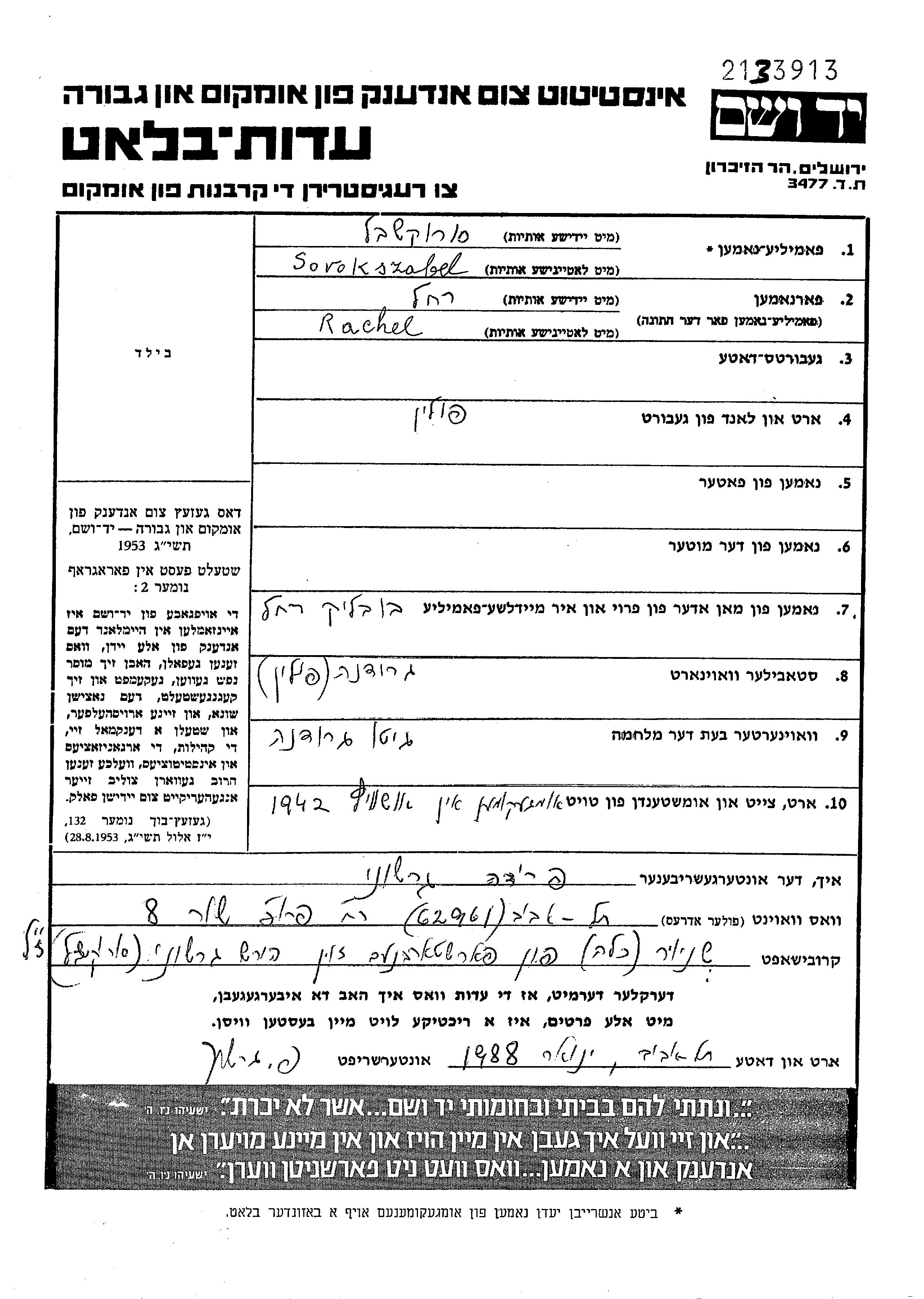 Sorokszabel Rachel Grodno, Polen Gedenkblatt