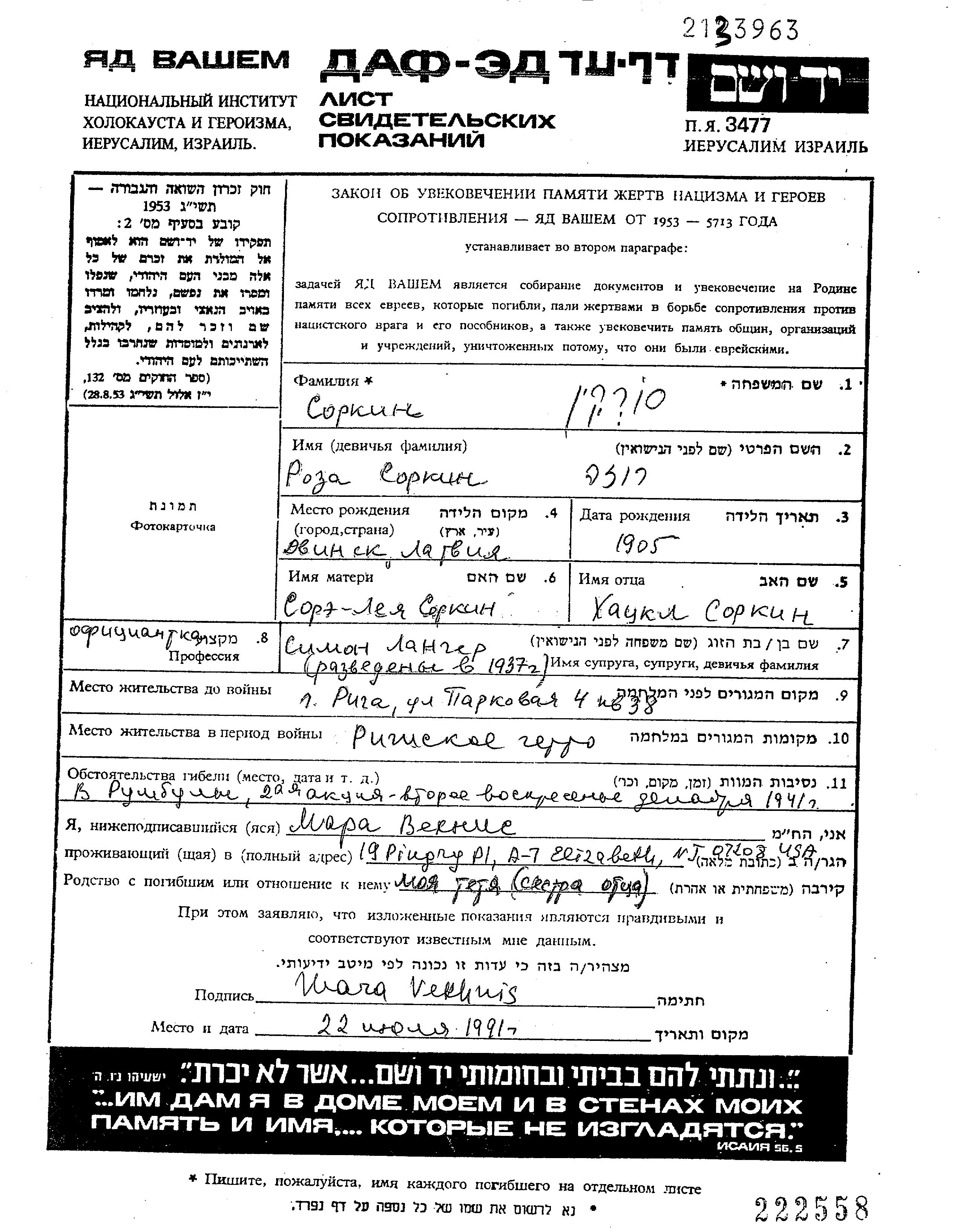Sorkin Langer Roza Riga, Lettland Gedenkblatt