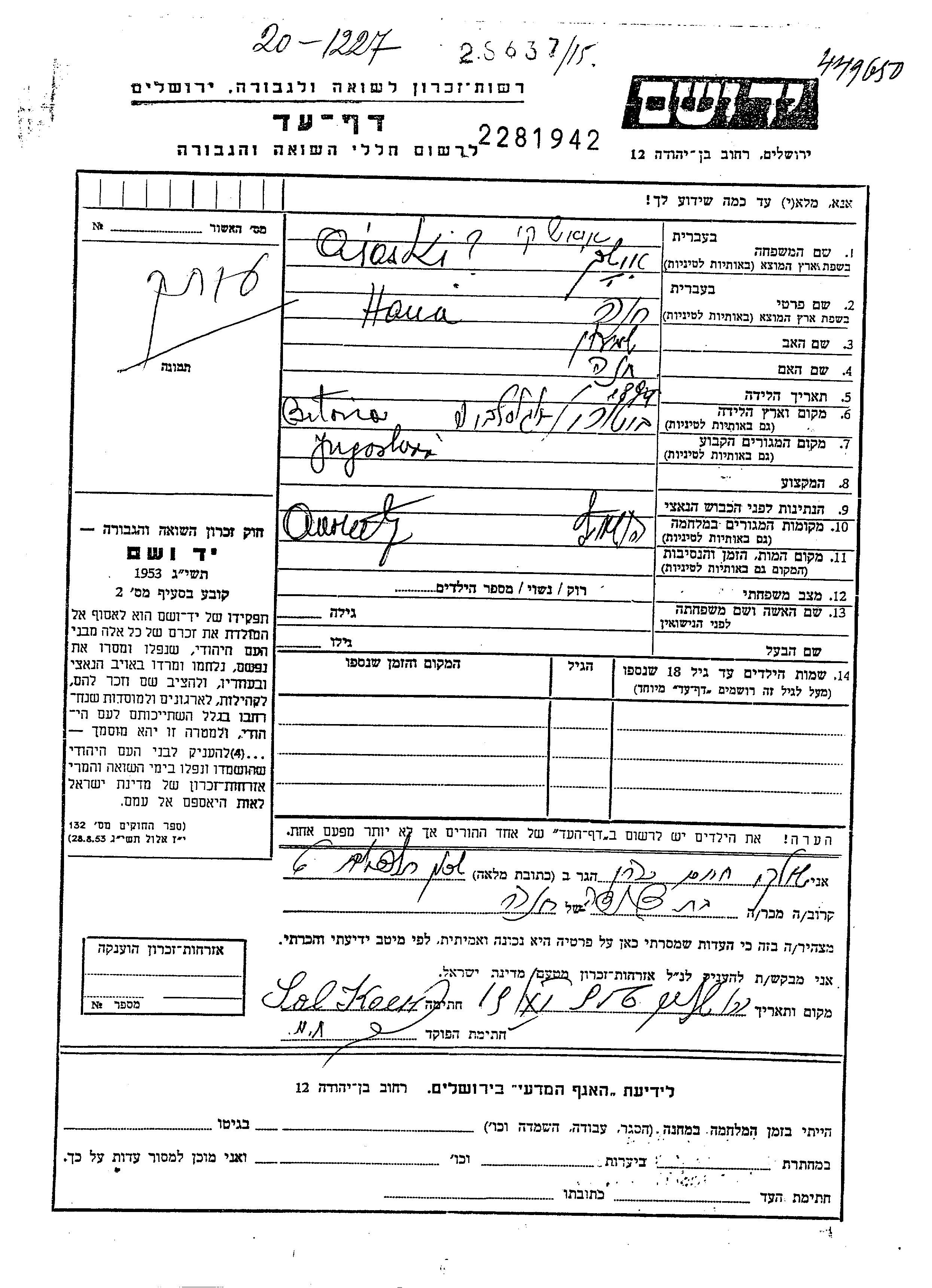 Hana Ajaski Itzkhaki wurde im Jahr 1894 in Bitola, Jugoslawien geboren. Vor dem Zweiten Weltkrieg lebte sie in Jugoslawien. Während des Krieges war sie in Jugoslawien.