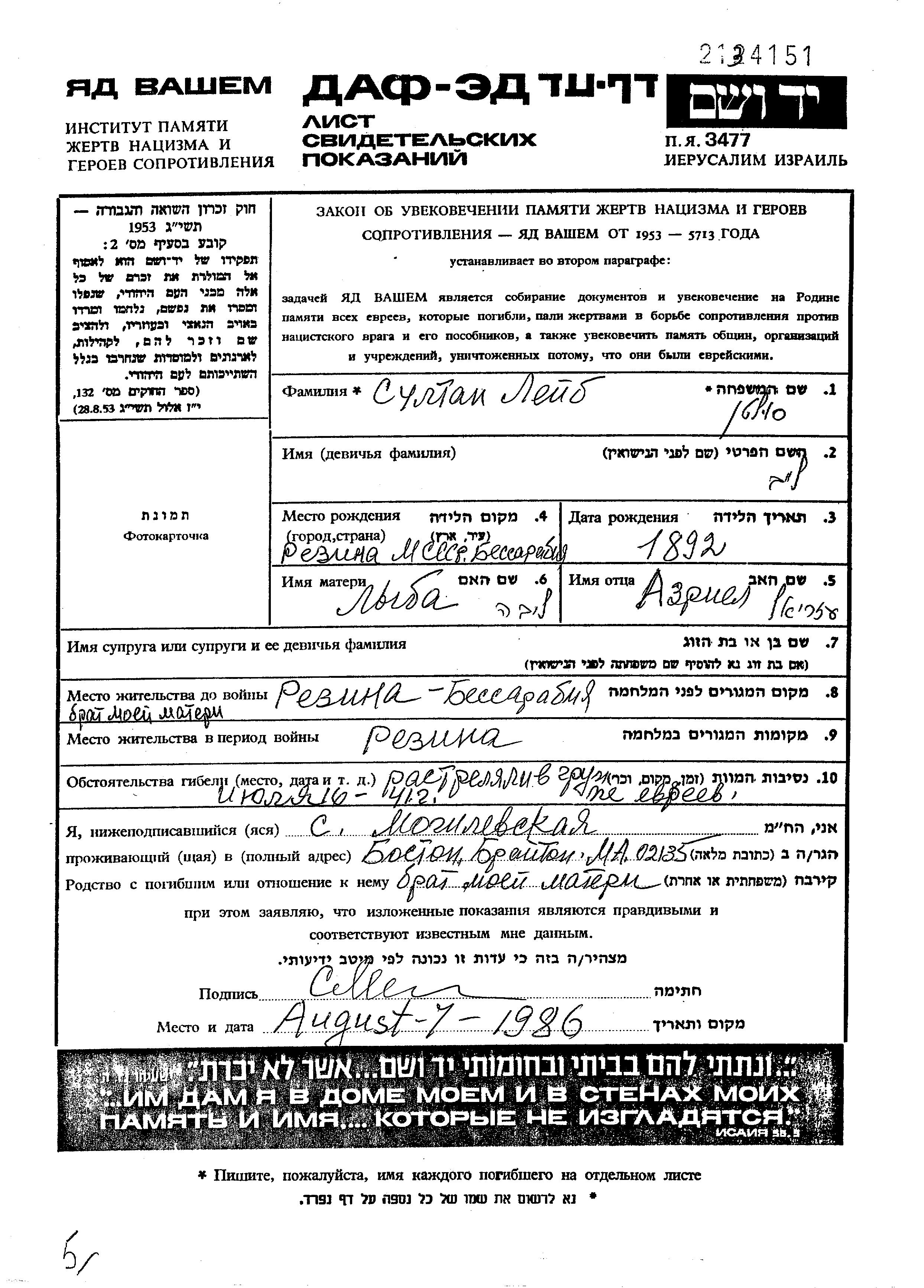 Leib wurde in der Schoah ermordet. Todesort: Rezina, Rumänien im Jahr 16/07/1941.