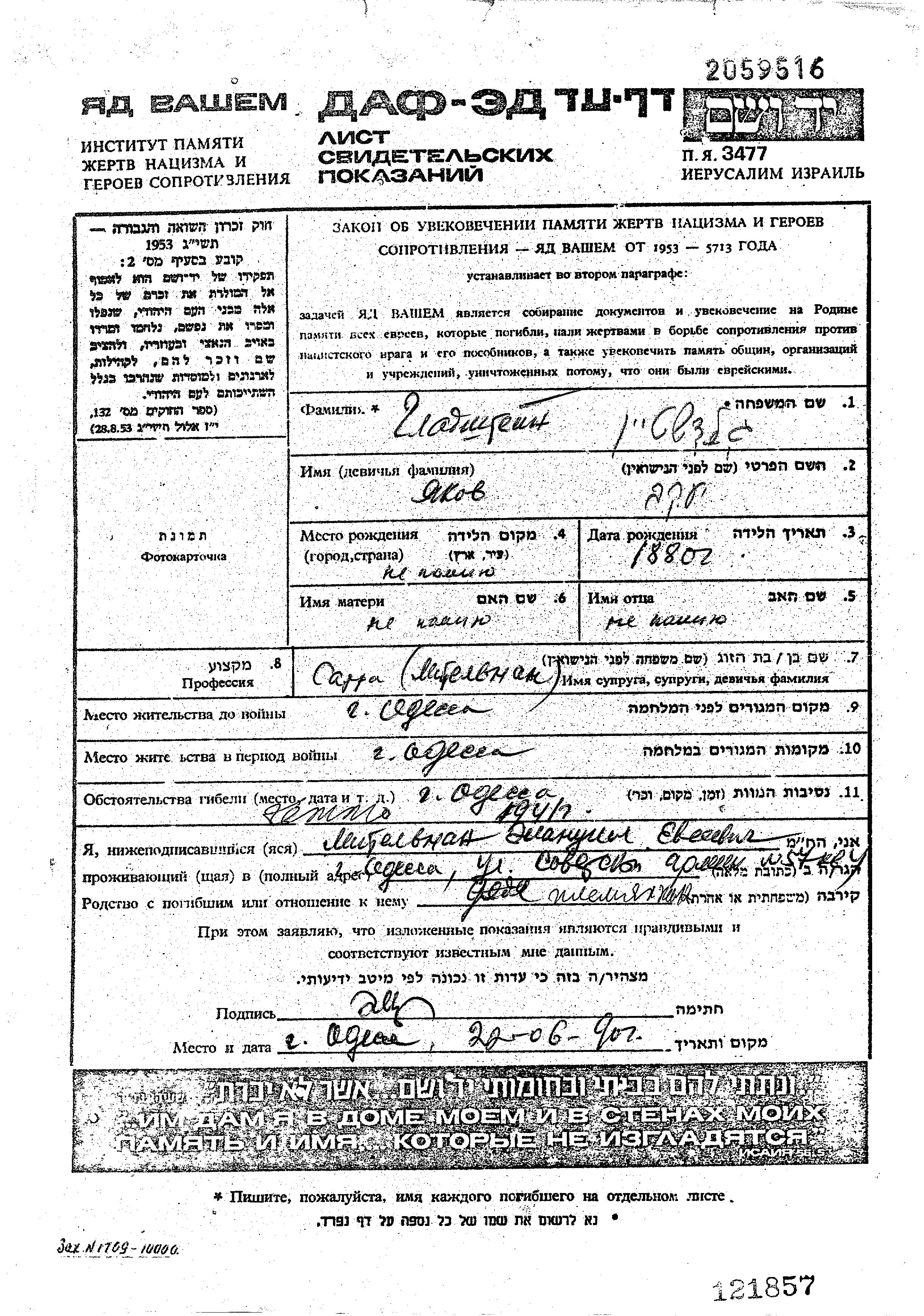 Yakov wurde in der Schoah ermordet. Todesort: Odessa, Ukraine (UdSSR) im Jahr 1941.