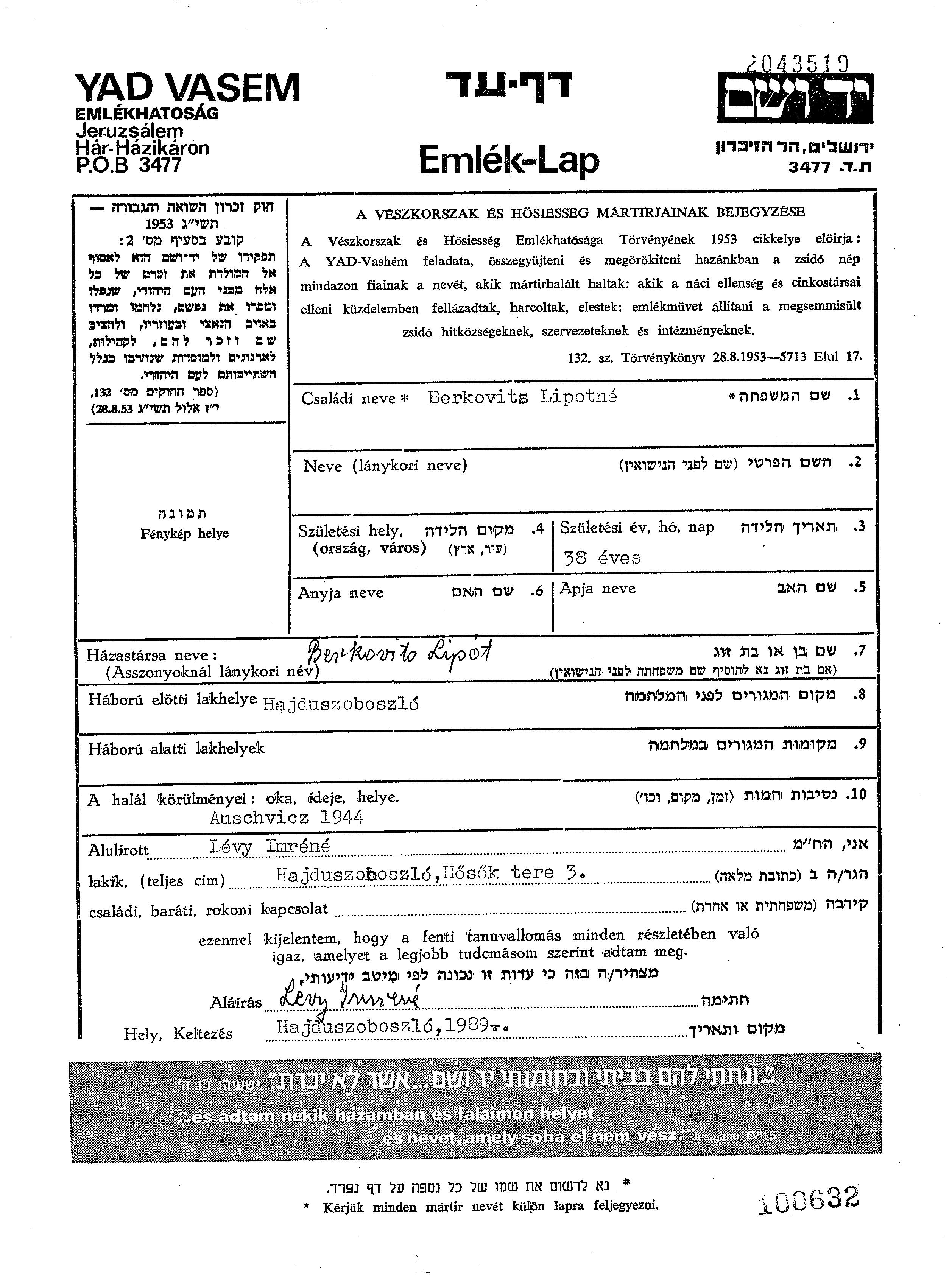 Vorname unbekannt Berkovits wurde im Jahr 1906 geboren. Sie war mit Lipot Verheiratet. Vor dem Zweiten Weltkrieg lebte sie in Hajduszoboszlo, Ungarn.