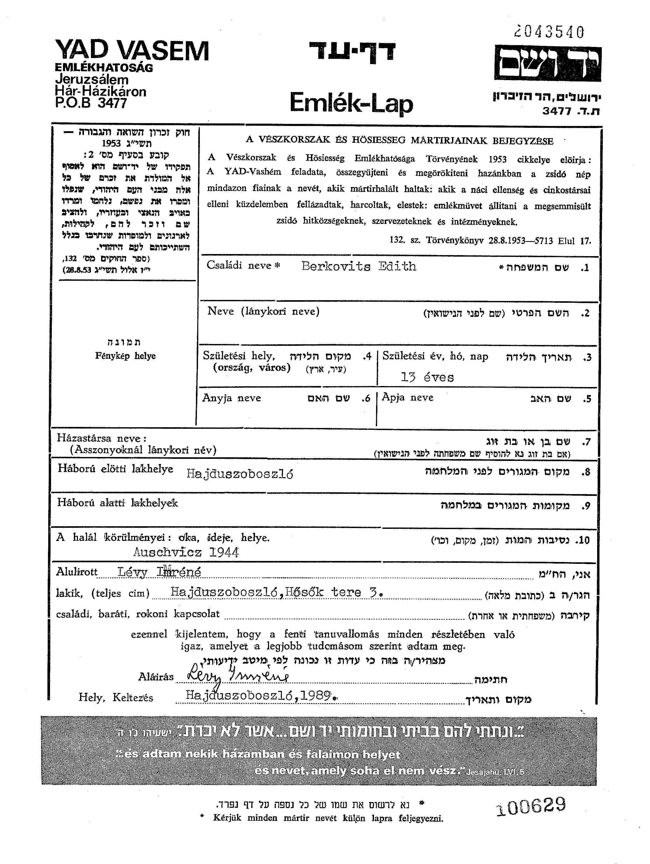 Berkovits Edith 1931 Hajduszoboszlo, Ungarn Gedenkblatt
