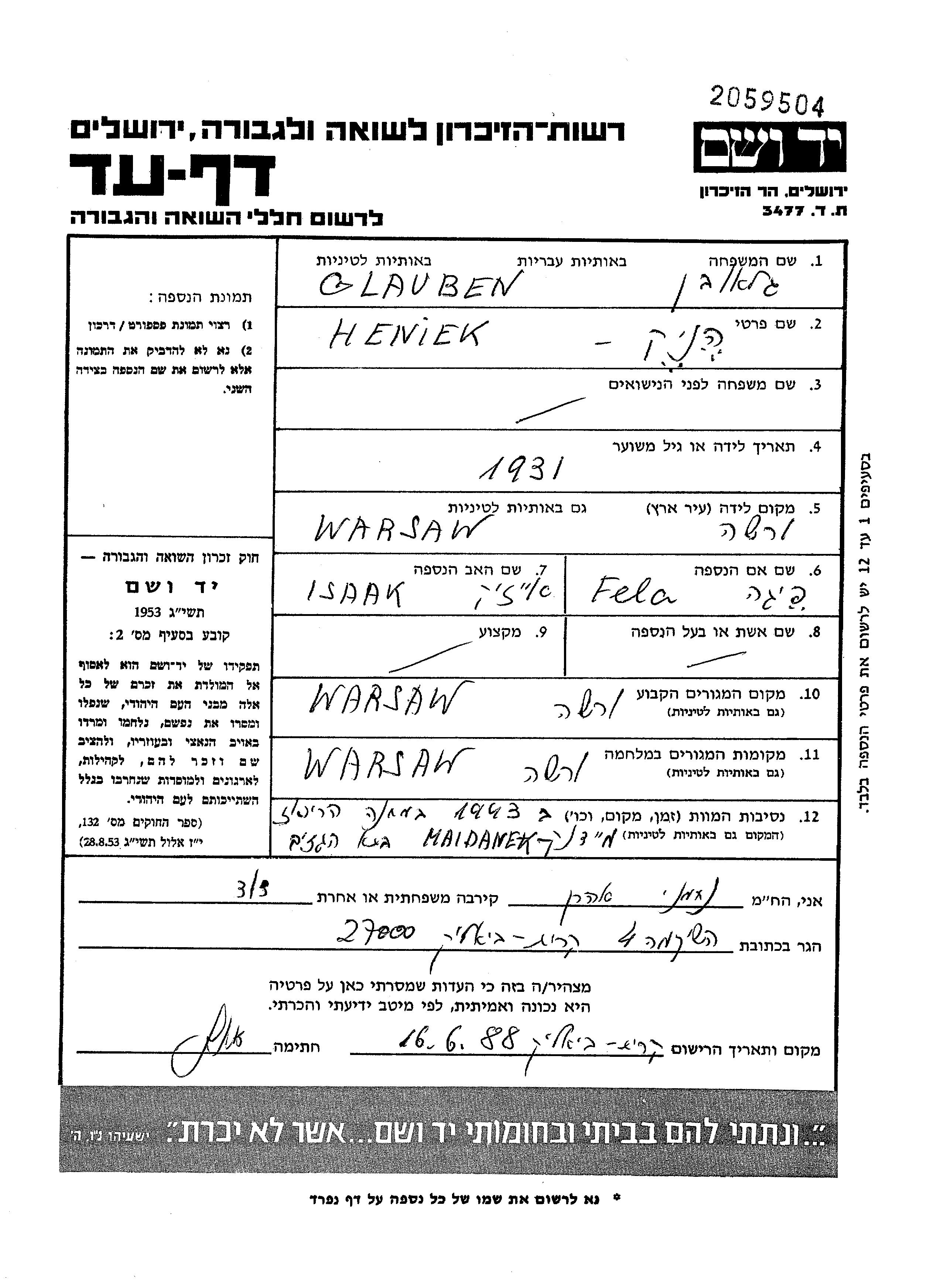 Henrik Glauben wurde im Jahr 1931 in Warszawa, Polen geboren. Er war der Sohn von Isaak und Fela Feiga, geb. Hoffman. Er war Kind. Vor dem Zweiten Weltkrieg lebte er in Warszawa, Polen. Während des Krieges war er in Warszawa, Polen.