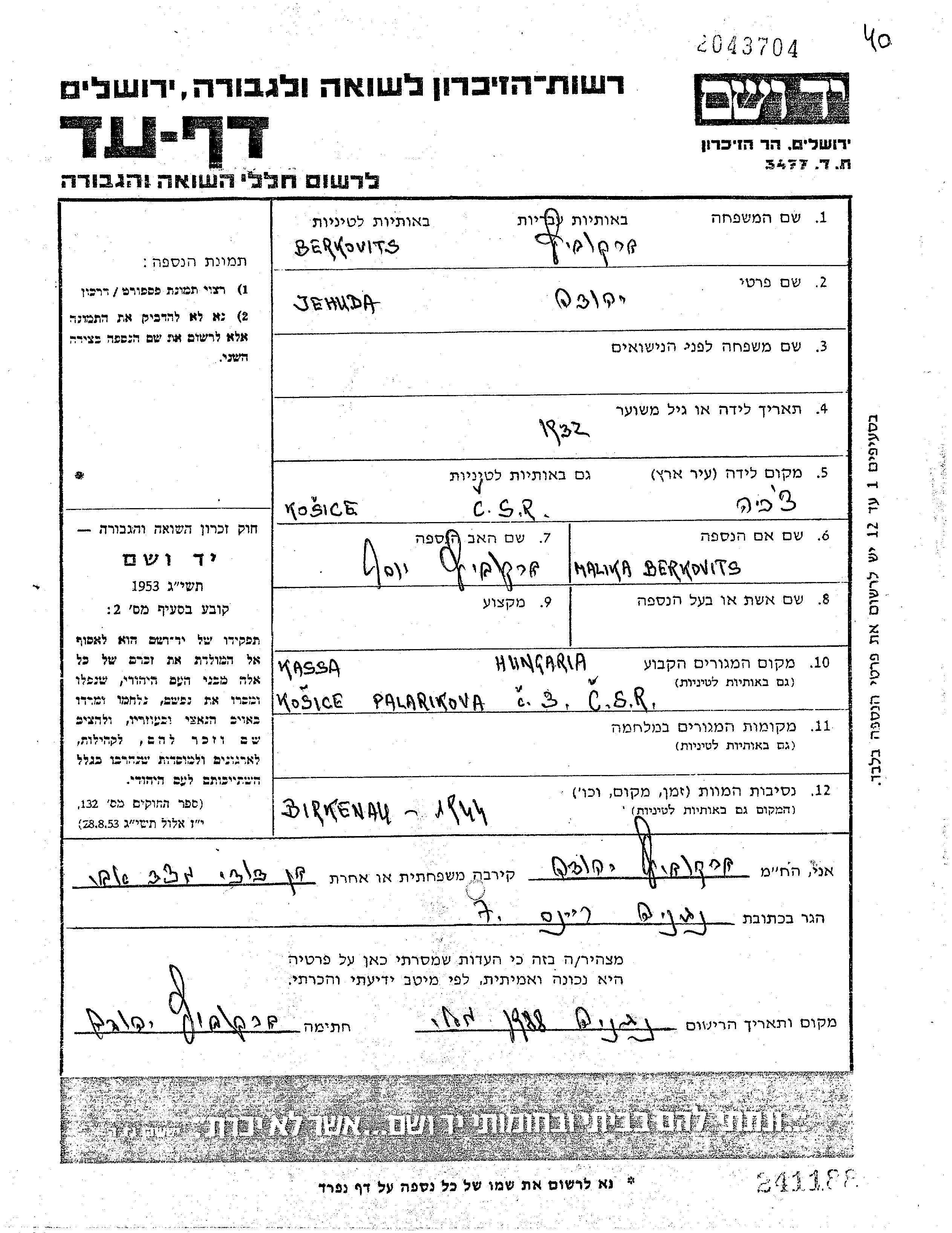 Jehuda wurde in der Schoah ermordet. Todesort: Birkenau, Polen im Jahr 1944.
