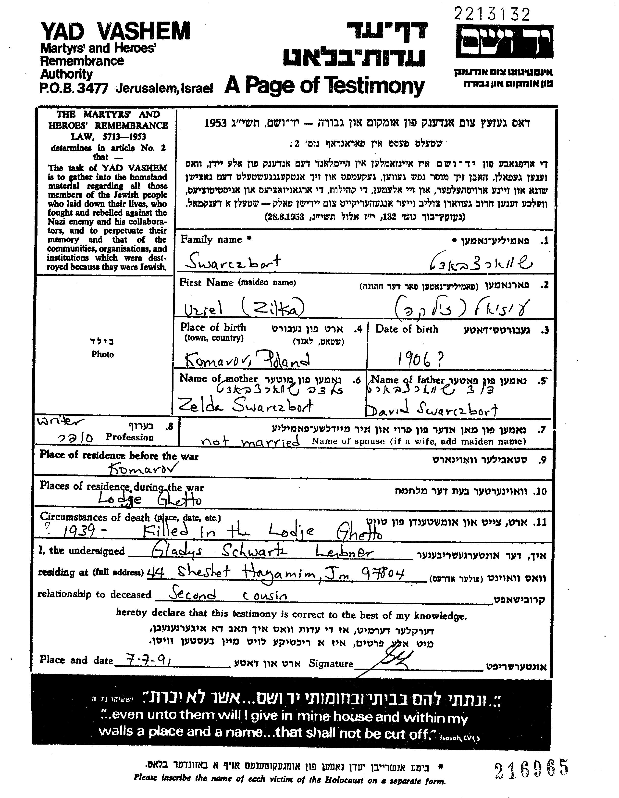 Zilka Uziel Swarczbort Shvartzbart wurde im Jahr 1906 in Komorowo, Polen geboren. Er war der Sohn von David und Zelda. Er war Schreiber und Ledig. Vor dem Zweiten Weltkrieg lebte er in Komorowo, Polen. Während des Krieges war er in Komorowo, Polen.
