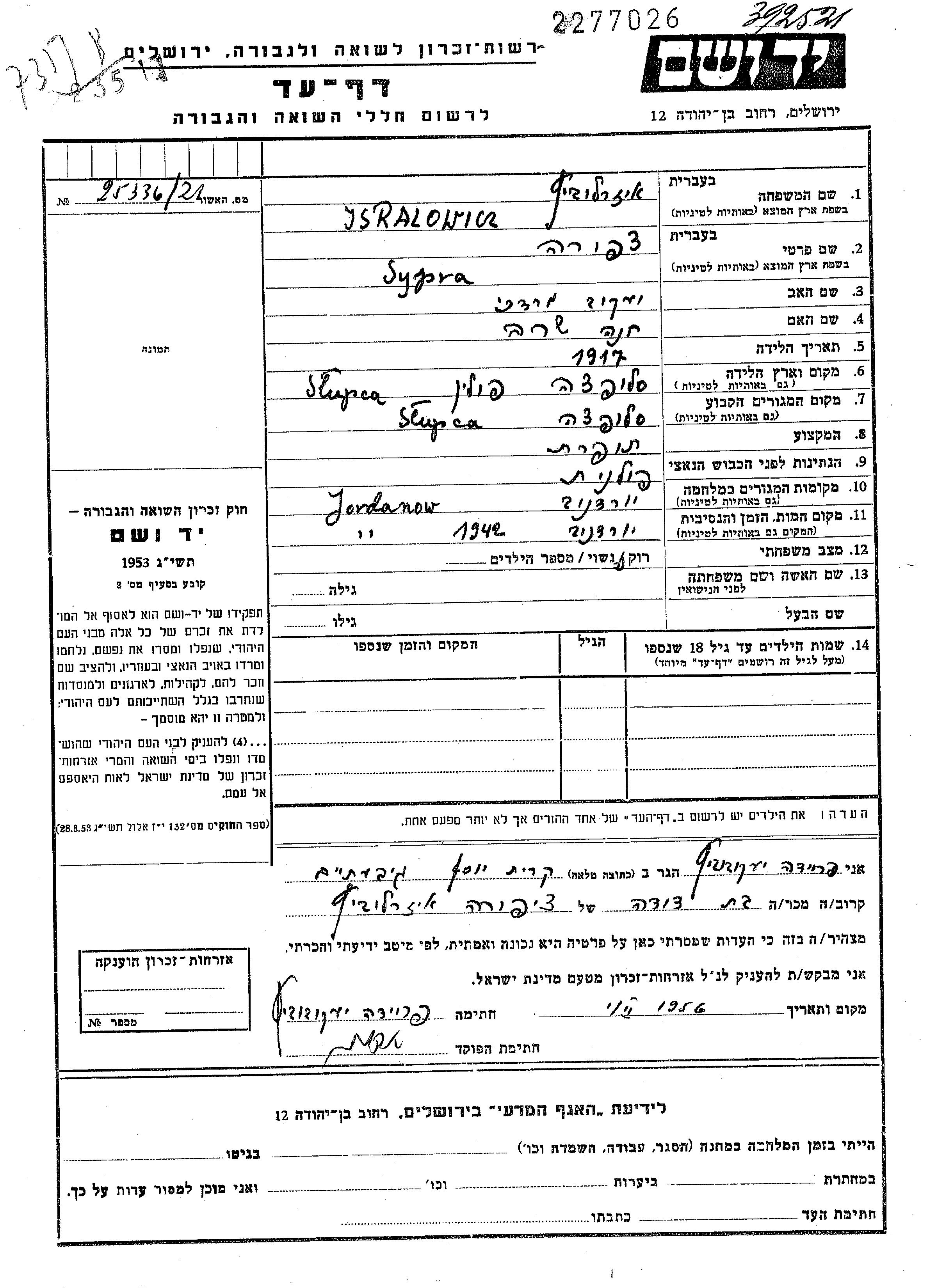 Sypra Isralowicz wurde im Jahr 1917 in Slupca, Polen geboren. Sie war die Tochter von Jakob Mordchai und Hana Sara. Sie war Schneiderin und Ledig. Vor dem Zweiten Weltkrieg lebte sie in Slupca, Polen. Während des Krieges war sie in Jordanow, Polen.