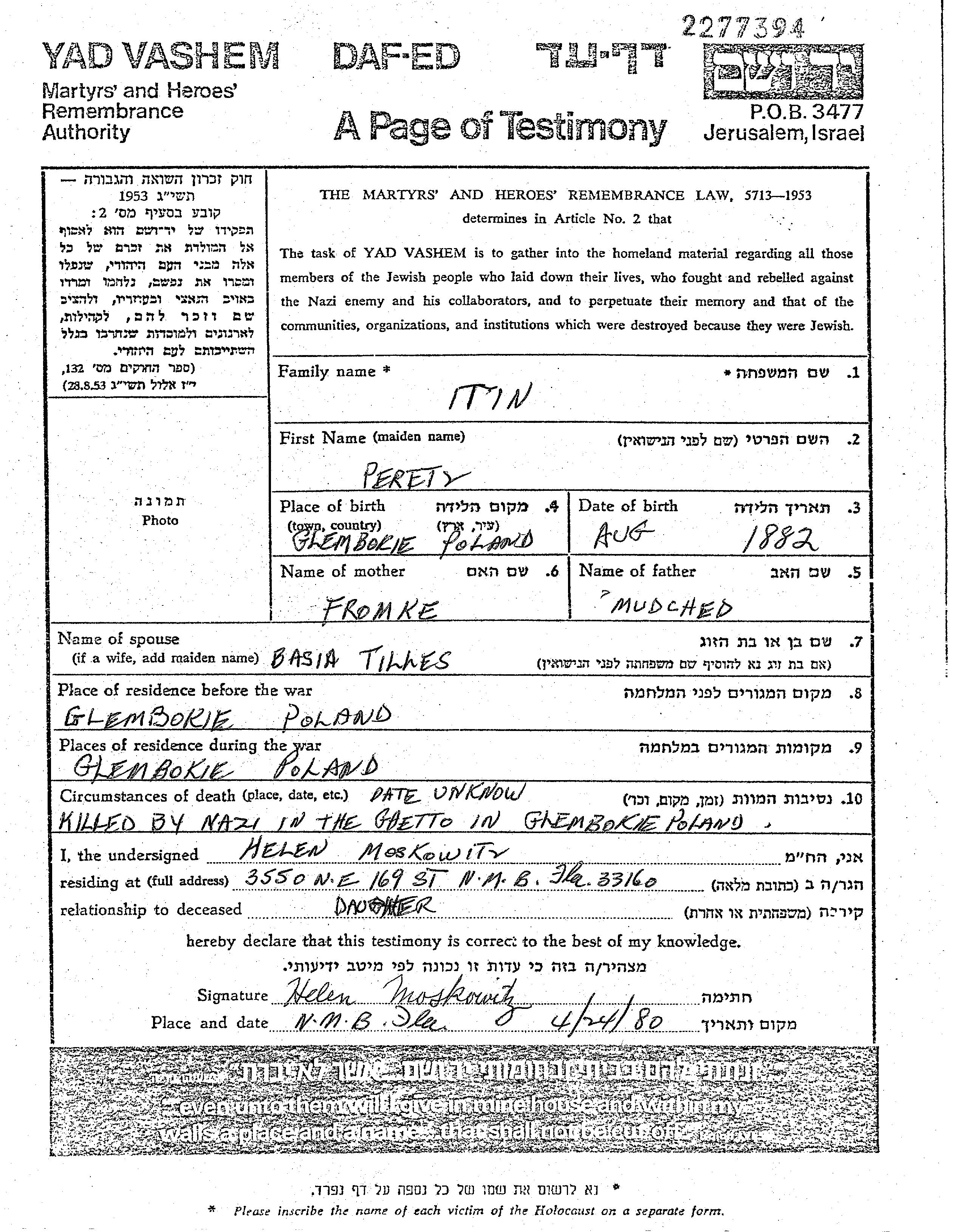 Peretz Itin wurde im Jahr 1882 in Glembokie, Polen geboren. Er war der Sohn von Mordekhai und Fromke. Er war mit Basia Verheiratet. Vor dem Zweiten Weltkrieg lebte er in Glembokie, Polen. Während des Krieges war er in Glembokie, Polen.