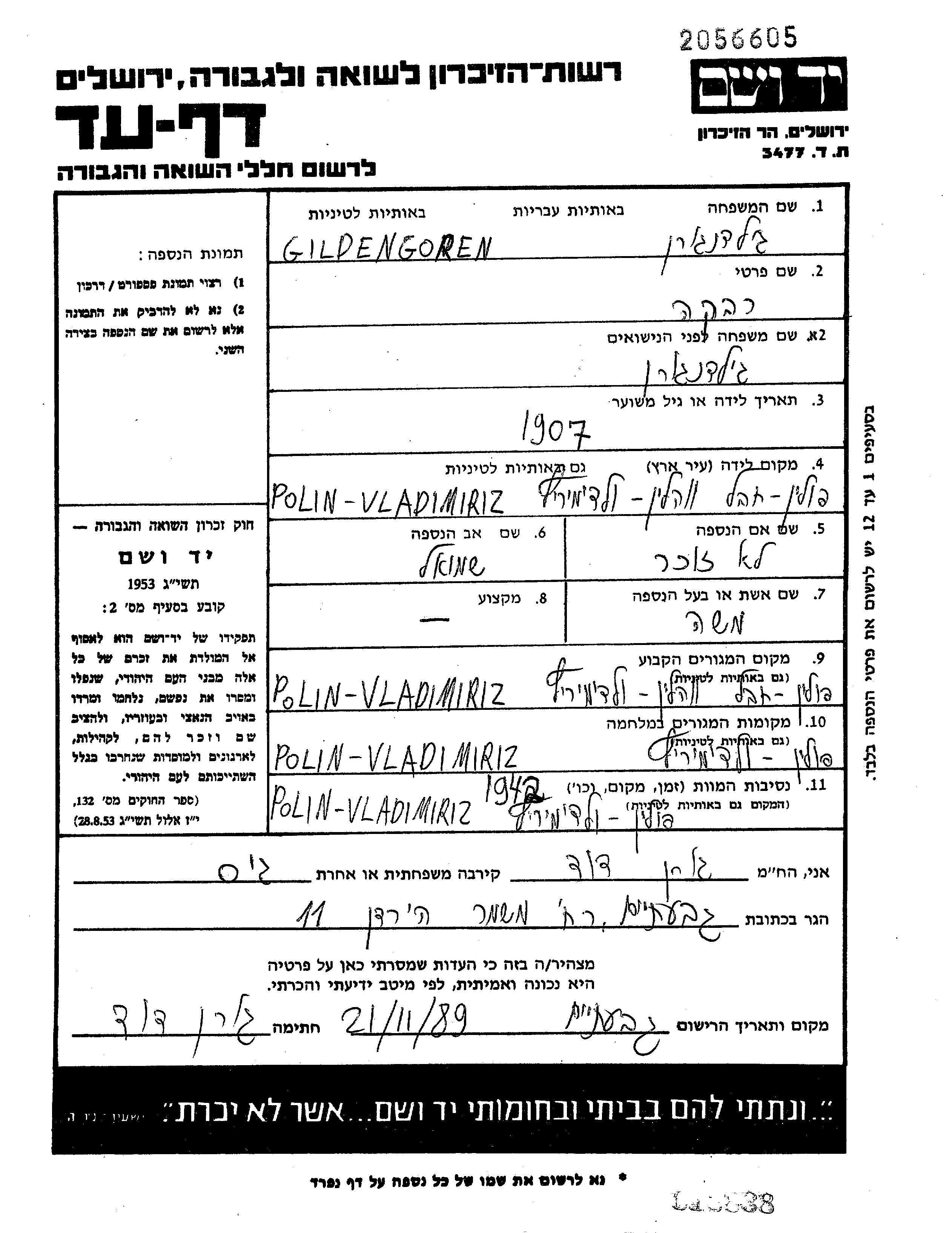 Rivka Gildengoren wurde im Jahr 1907 in Wlodzimierz Wolynski, Polen geboren. Sie war die Tochter von Shmuel. Sie war mit Moshe Verheiratet. Vor dem Zweiten Weltkrieg lebte sie in Wlodzimierz Wolynski, Polen. Während des Krieges war sie in Wlodzimierz Wolynski, Polen.