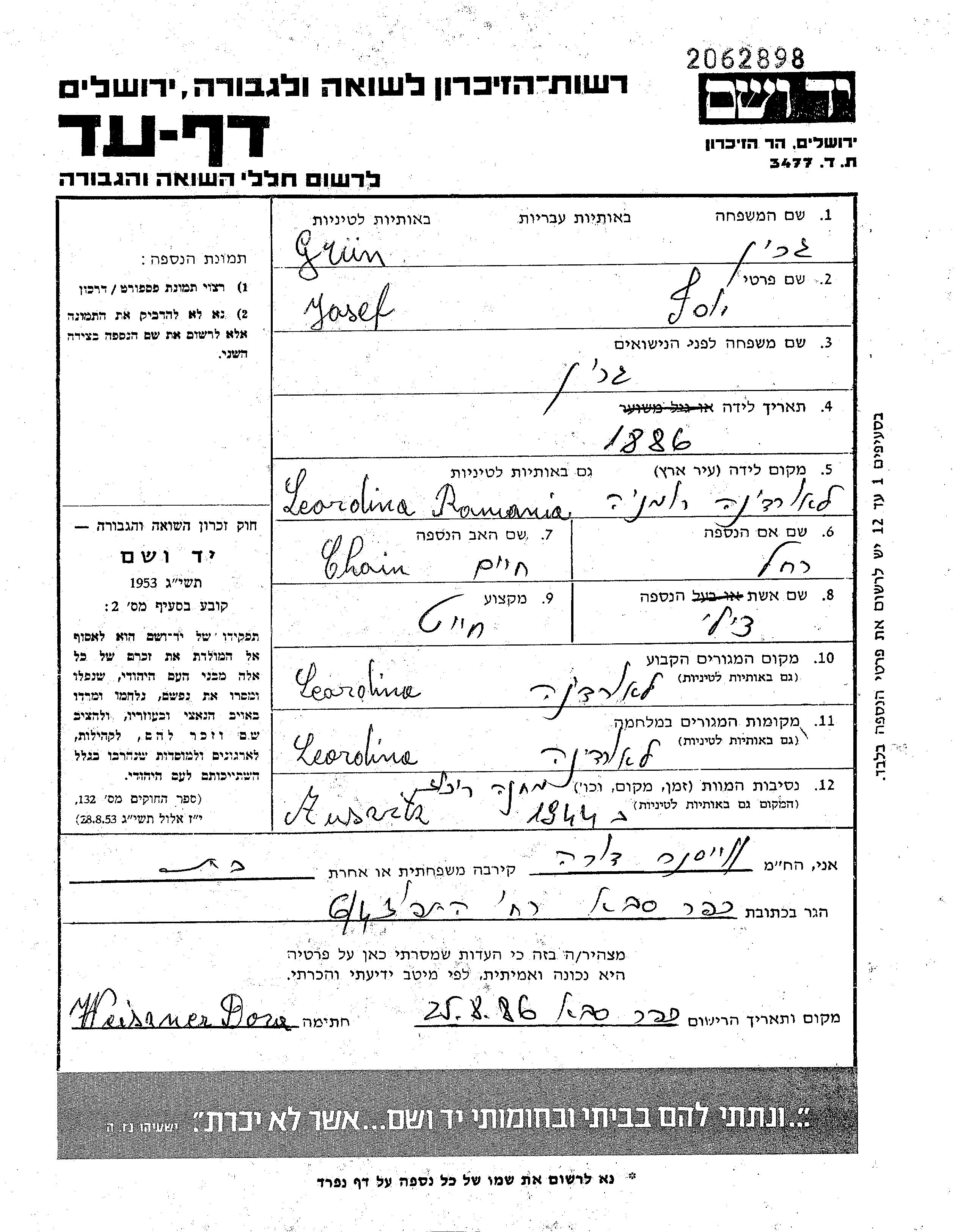 Josef Grün wurde im Jahr 1886 in Leordeni, Rumänien geboren. Er war der Sohn von Chaim und Rakhel. Er war Schneider und mit Tzili Verheiratet. Vor dem Zweiten Weltkrieg lebte er in Leordeni, Rumänien. Während des Krieges war er in Leordeni, Rumänien.
