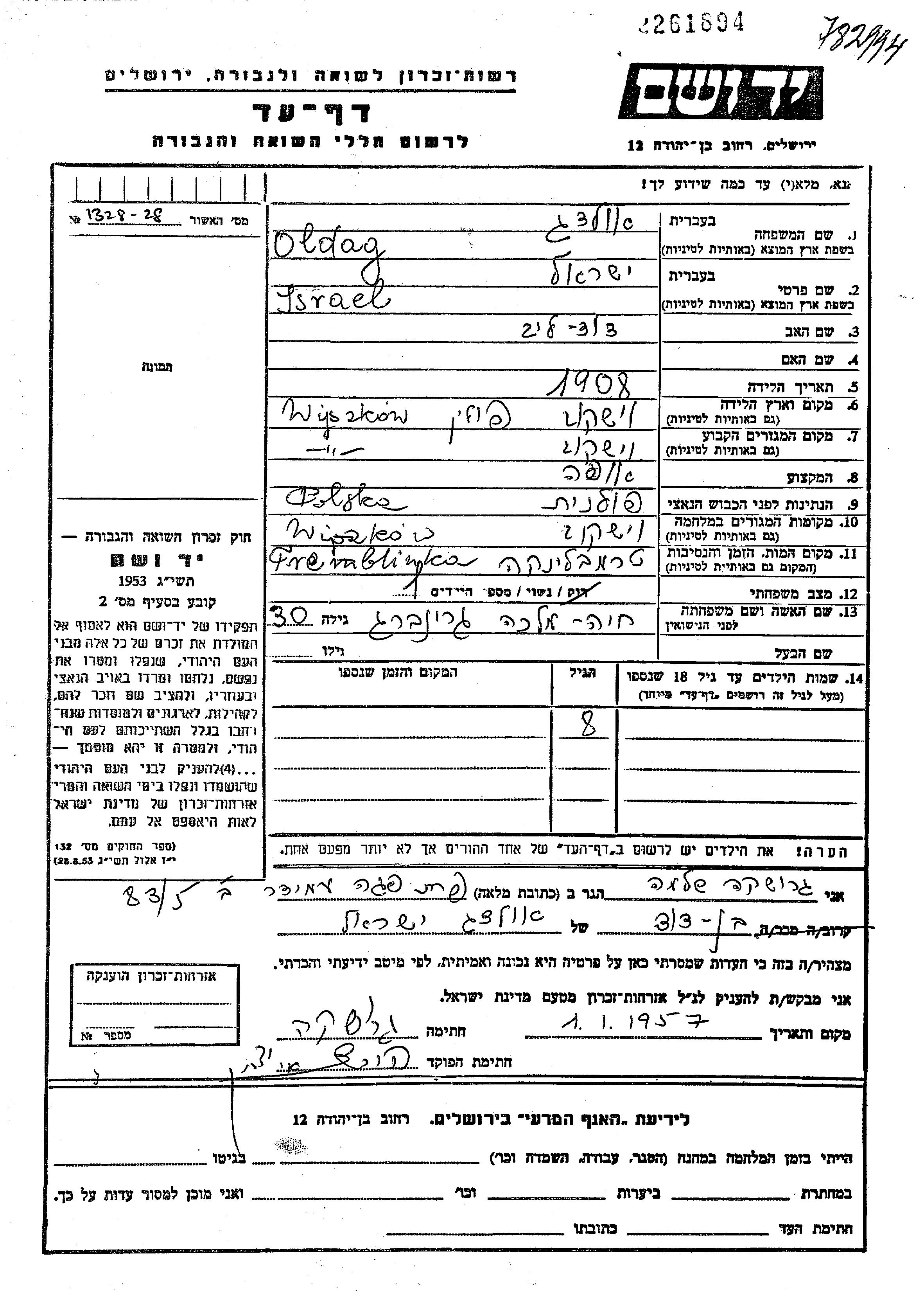 Israel Oldag wurde im Jahr 1908 in Wyszkow, Polen geboren. Er war der Sohn von David Leib. Er war Bäcker/-in und mit Khaia Malka Verheiratet. Vor dem Zweiten Weltkrieg lebte er in Wyszkow, Polen. Während des Krieges war er in Wyszkow, Polen.