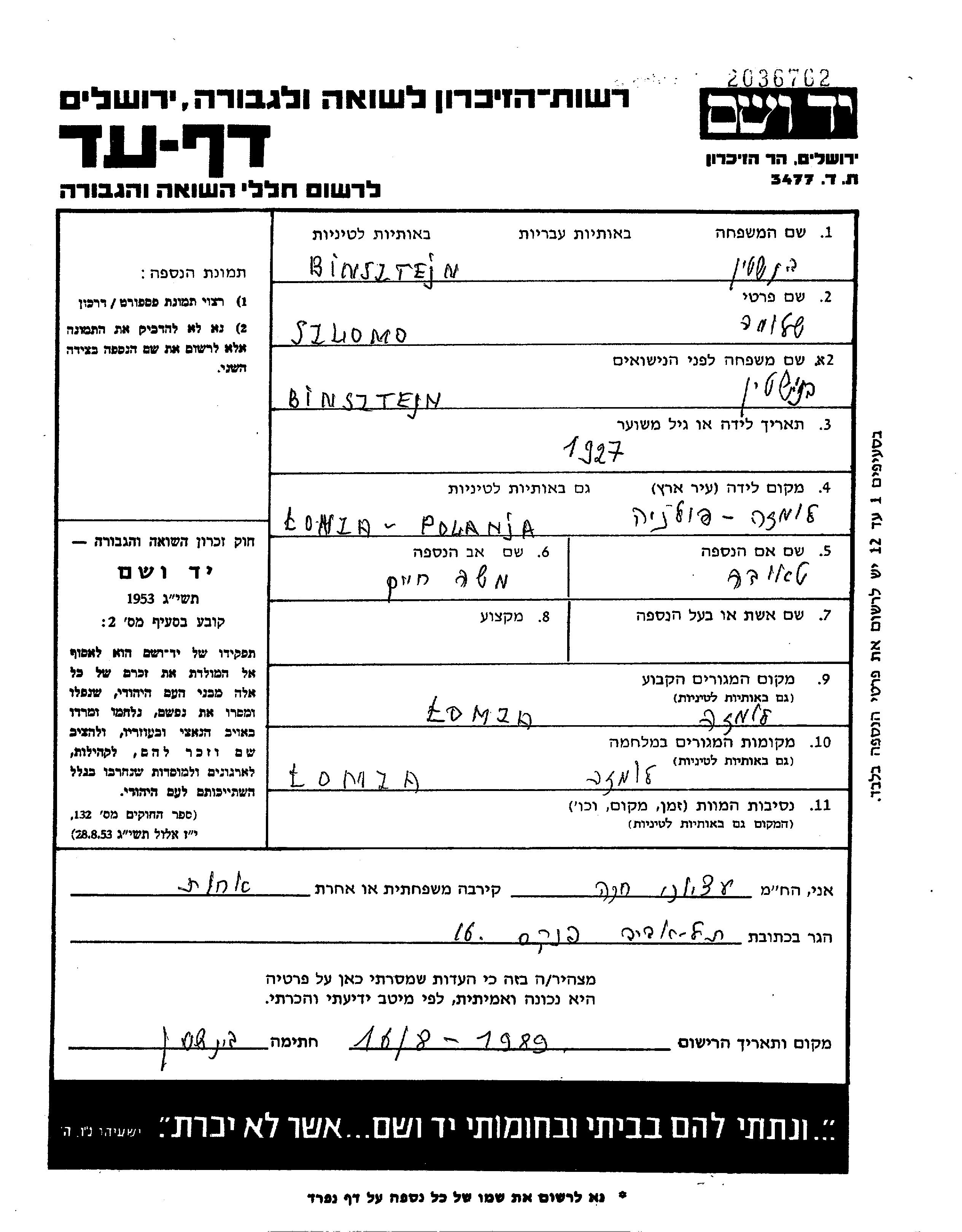 Binsztejn Szlomo 1927 Łomża, Polen Gedenkblatt