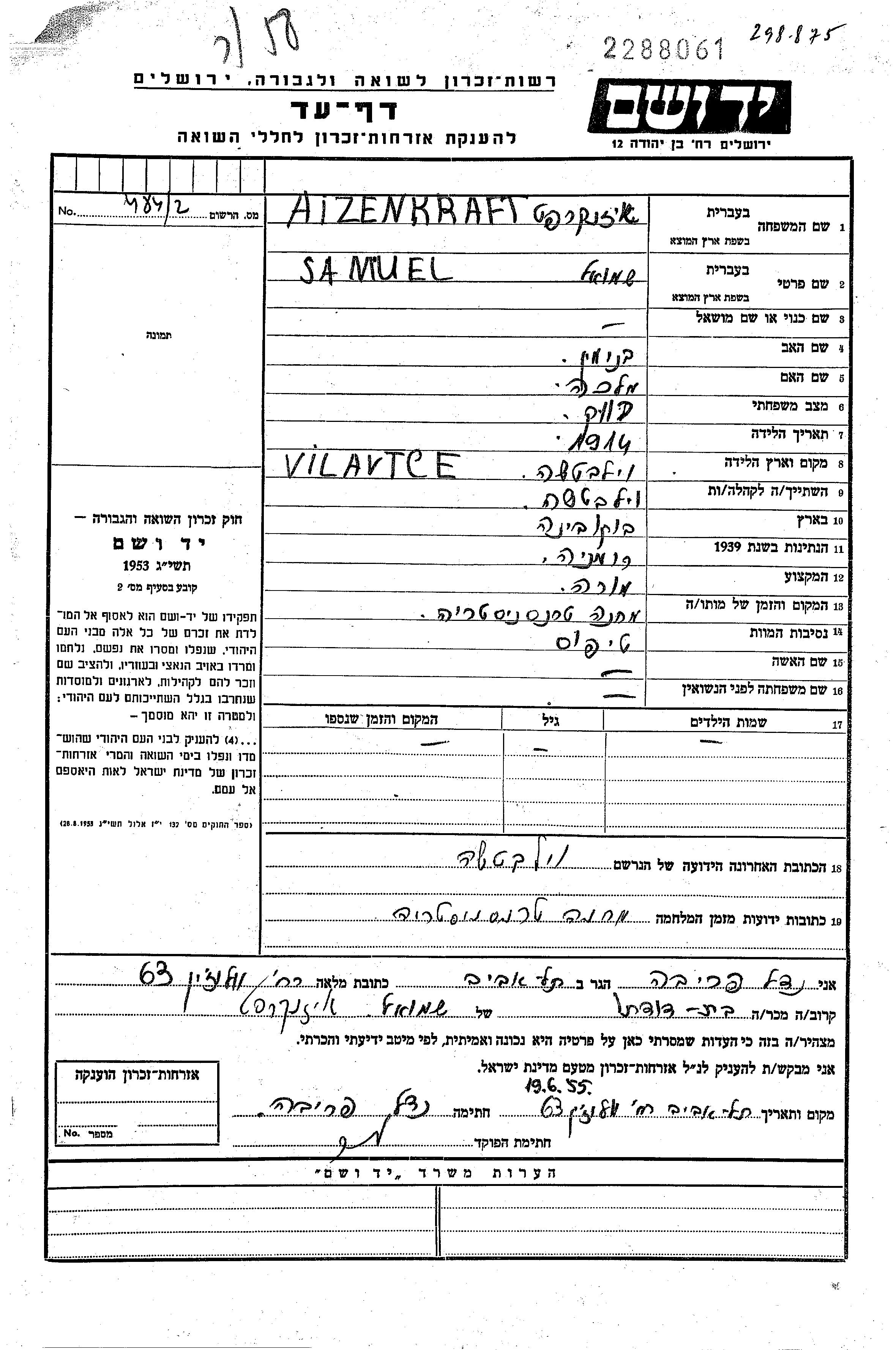 Shmuel Aizenkraft wurde im Jahr 1914 in Vilaucea, Rumänien geboren. Er war der Sohn von Biniamin und Malcka, geb. Dermer. Er war Lehrer/in und Ledig. Vor dem Zweiten Weltkrieg lebte er in Vilaucea, Rumänien. Während des Krieges war er in Transnistria, Ukraine (UdSSR).