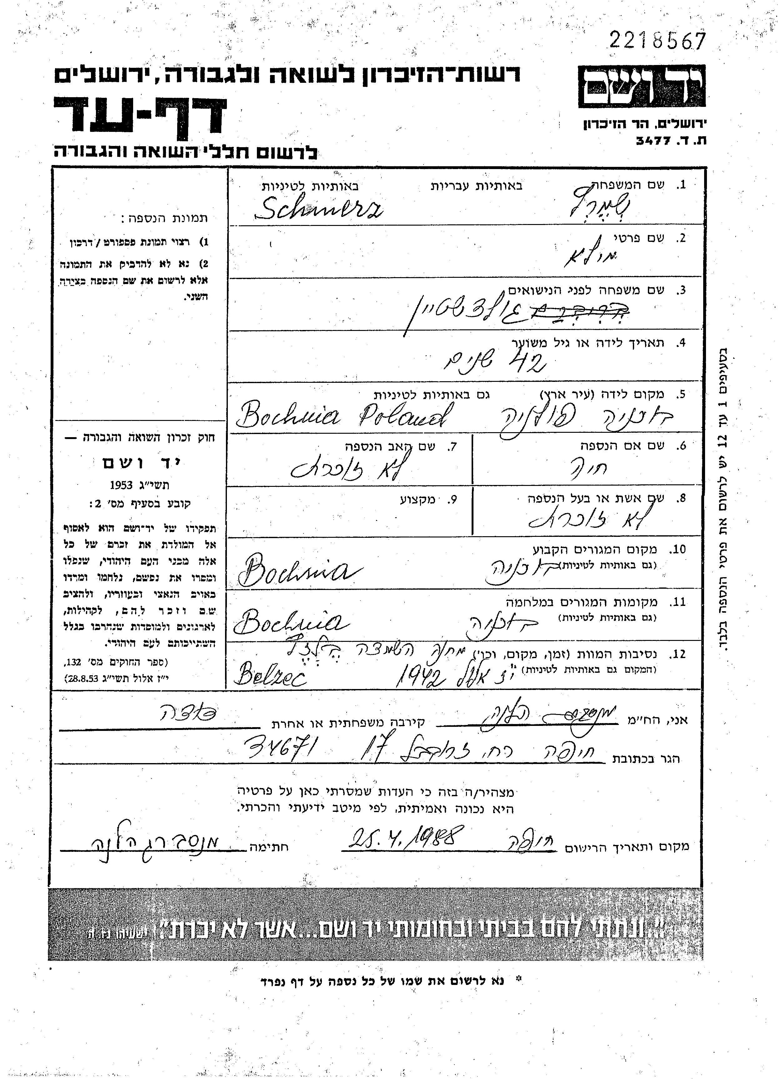 Mila Schmerz, geb. Goldshtein wurde in Bochnia, Polen geboren. Sie war die Tochter von Khaia. Sie war Verheiratet. Vor dem Zweiten Weltkrieg lebte sie in Bochnia, Polen. Während des Krieges war sie in Bochnia, Polen.