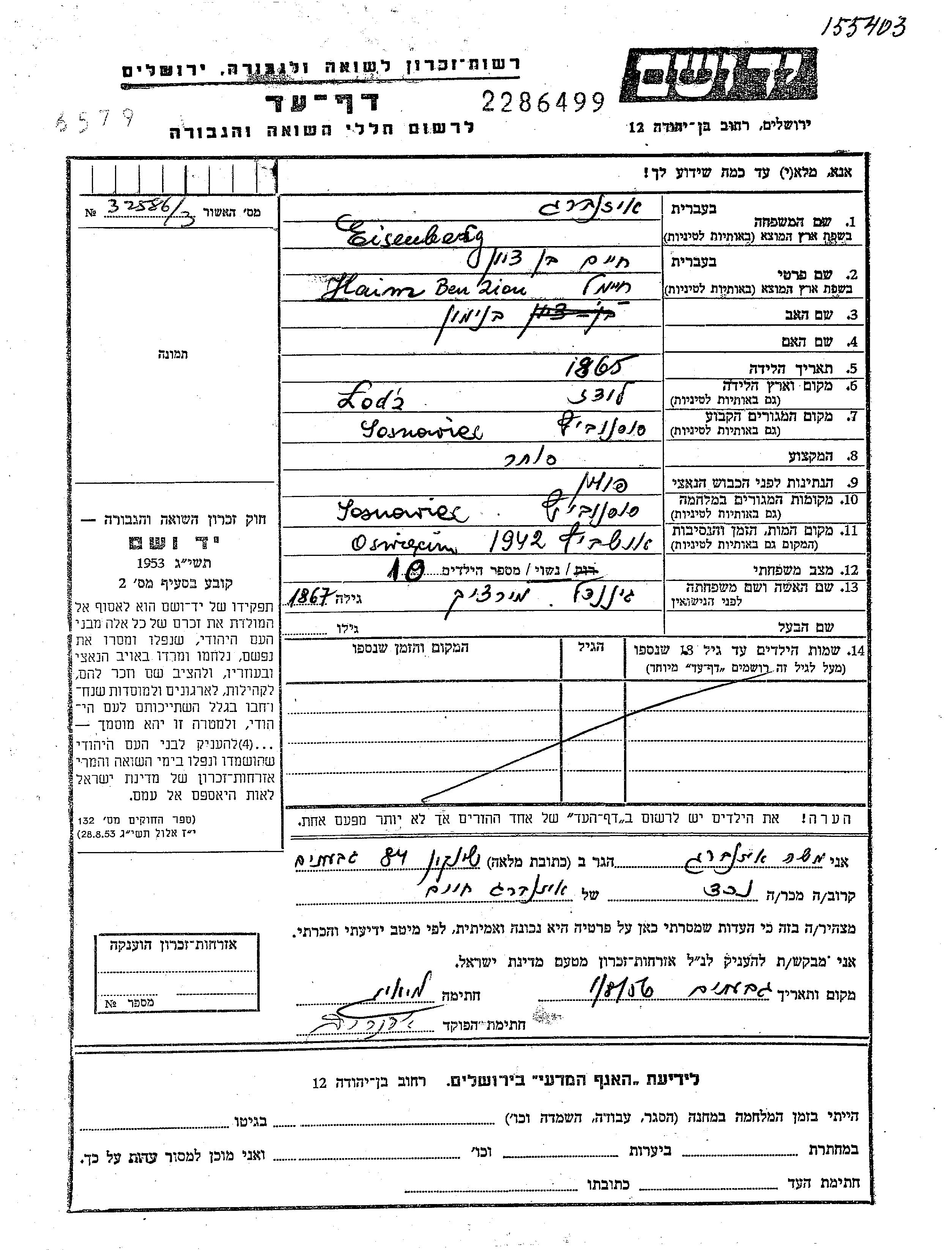 Haim Ben Zion Bentzion wurde in der Schoah ermordet. Todesort: Auschwitz, Polen im Jahr 1942.