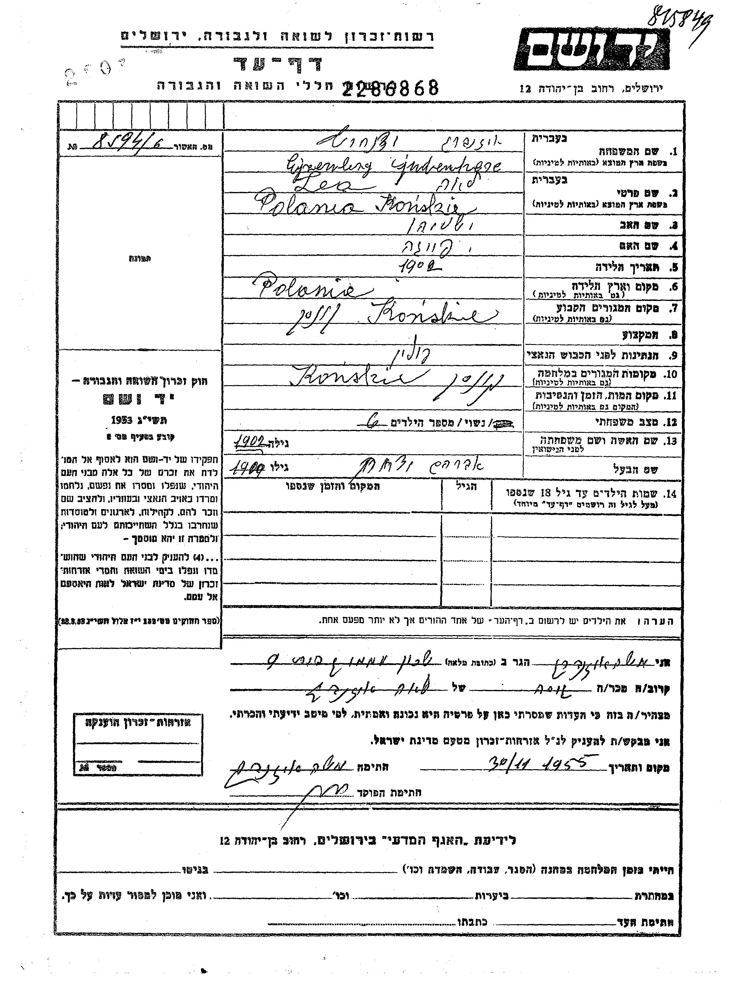 Lea Ejzenberg, geb. Judenherz wurde im Jahr 1902 in Konskie, Polen geboren. Sie war die Tochter von Yeshaiahu und Feiga. Sie war mit Abraham Ytzkhak Verheiratet. Vor dem Zweiten Weltkrieg lebte sie in Konskie, Polen. Während des Krieges war sie in Konskie, Polen.