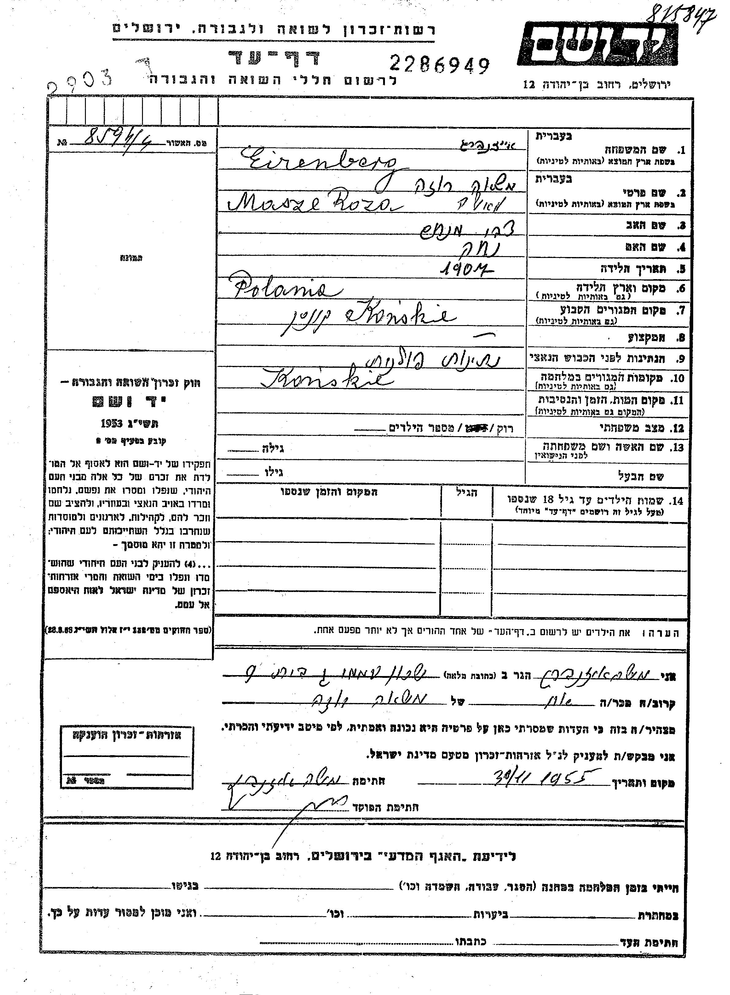 Masze Masha Roza Eizenberg wurde im Jahr 1907 in Polen geboren. Sie war die Tochter von Tzvi Menakhem und Nekha. Sie war Ledig. Vor dem Zweiten Weltkrieg lebte sie in Konskie, Polen. Während des Krieges war sie in Konskie, Polen.