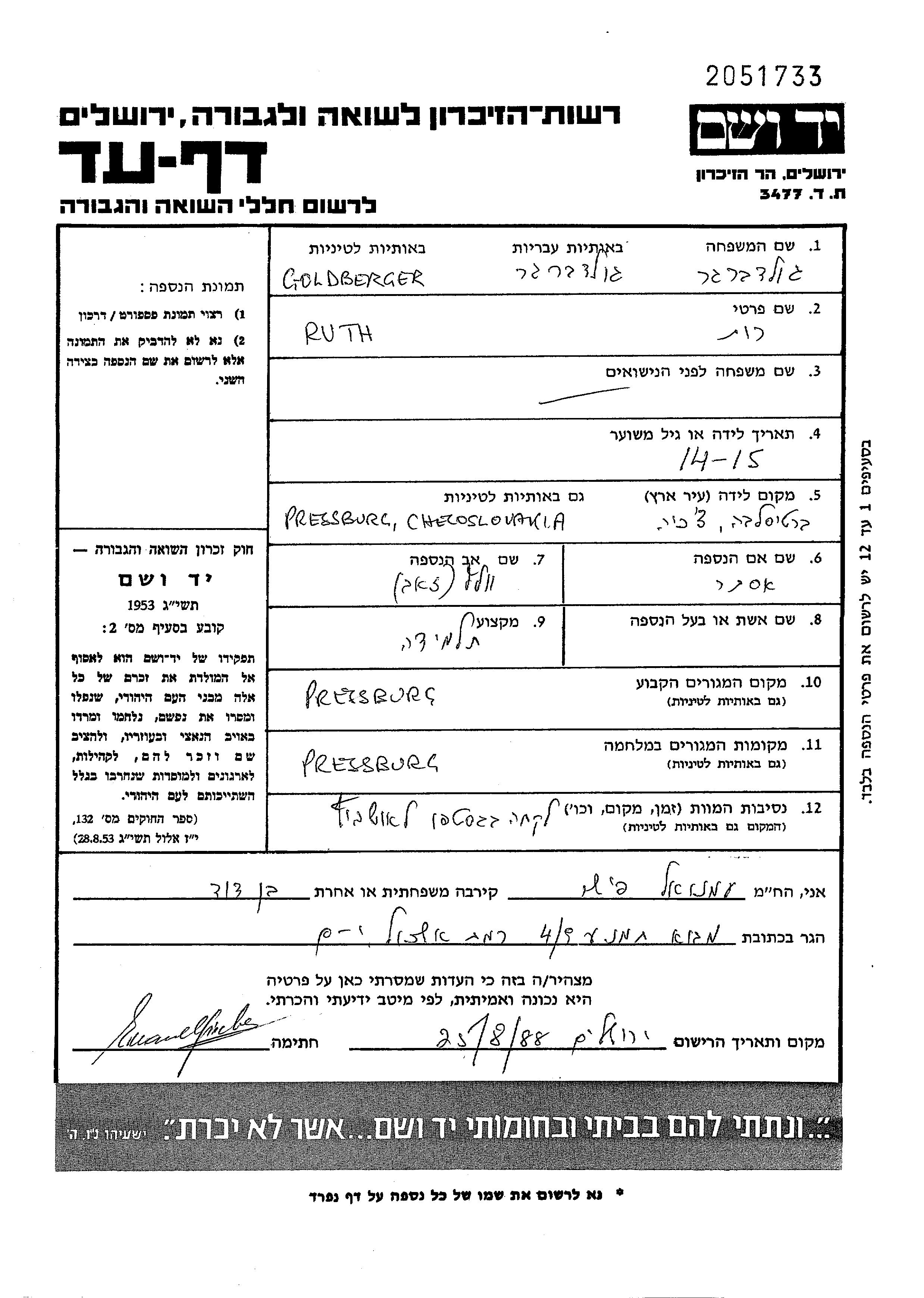 Goldberger Ruth Pressburg, Tschechoslowakei Gedenkblatt