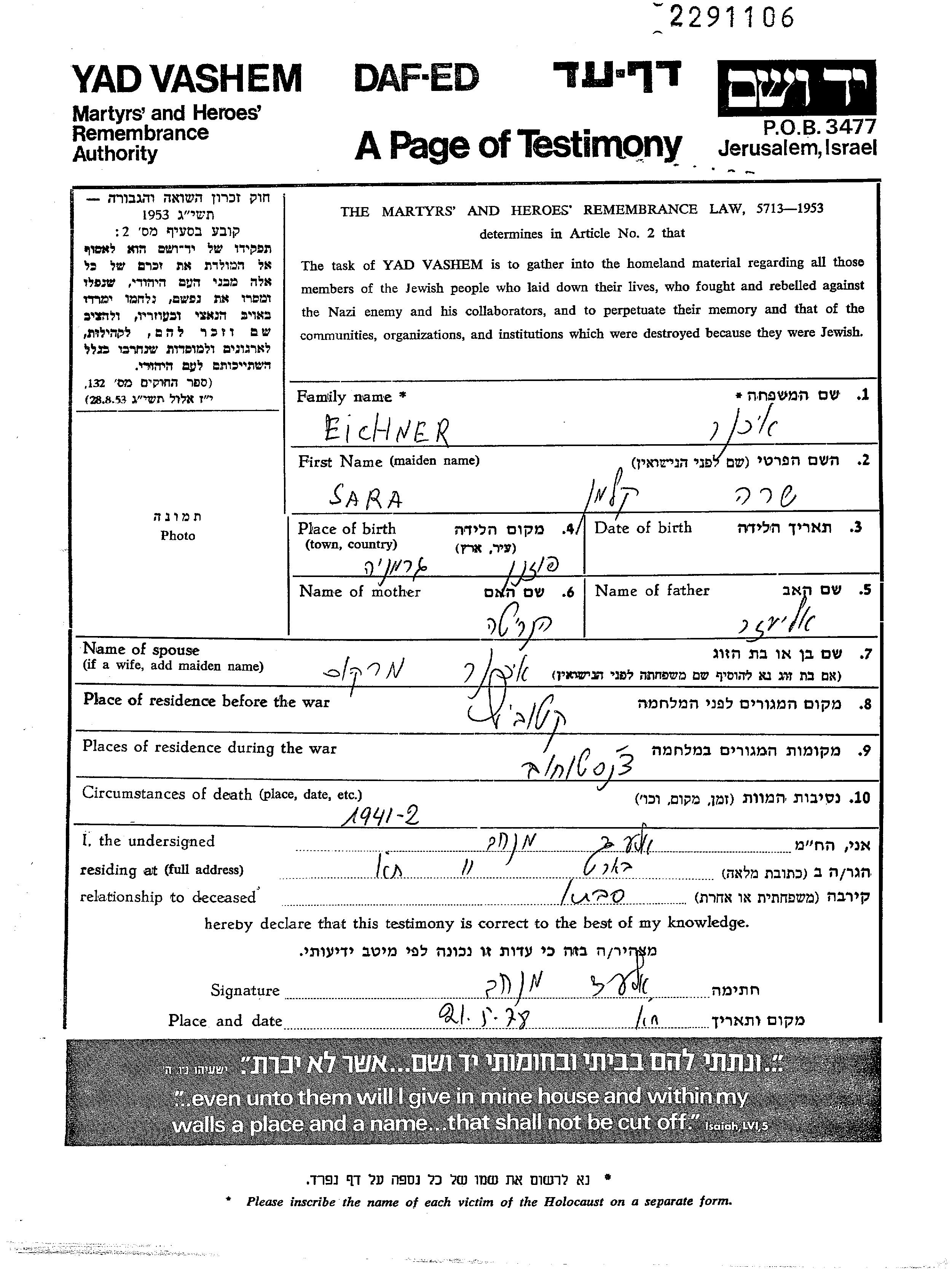 Sara Eichner, geb. Kalman wurde in Georgien (UdSSR) geboren. Sie war die Tochter von Eliezer und Henrieta. Sie war mit Markus Verheiratet. Vor dem Zweiten Weltkrieg lebte sie in Katowice, Polen. Während des Krieges war sie in Polen.