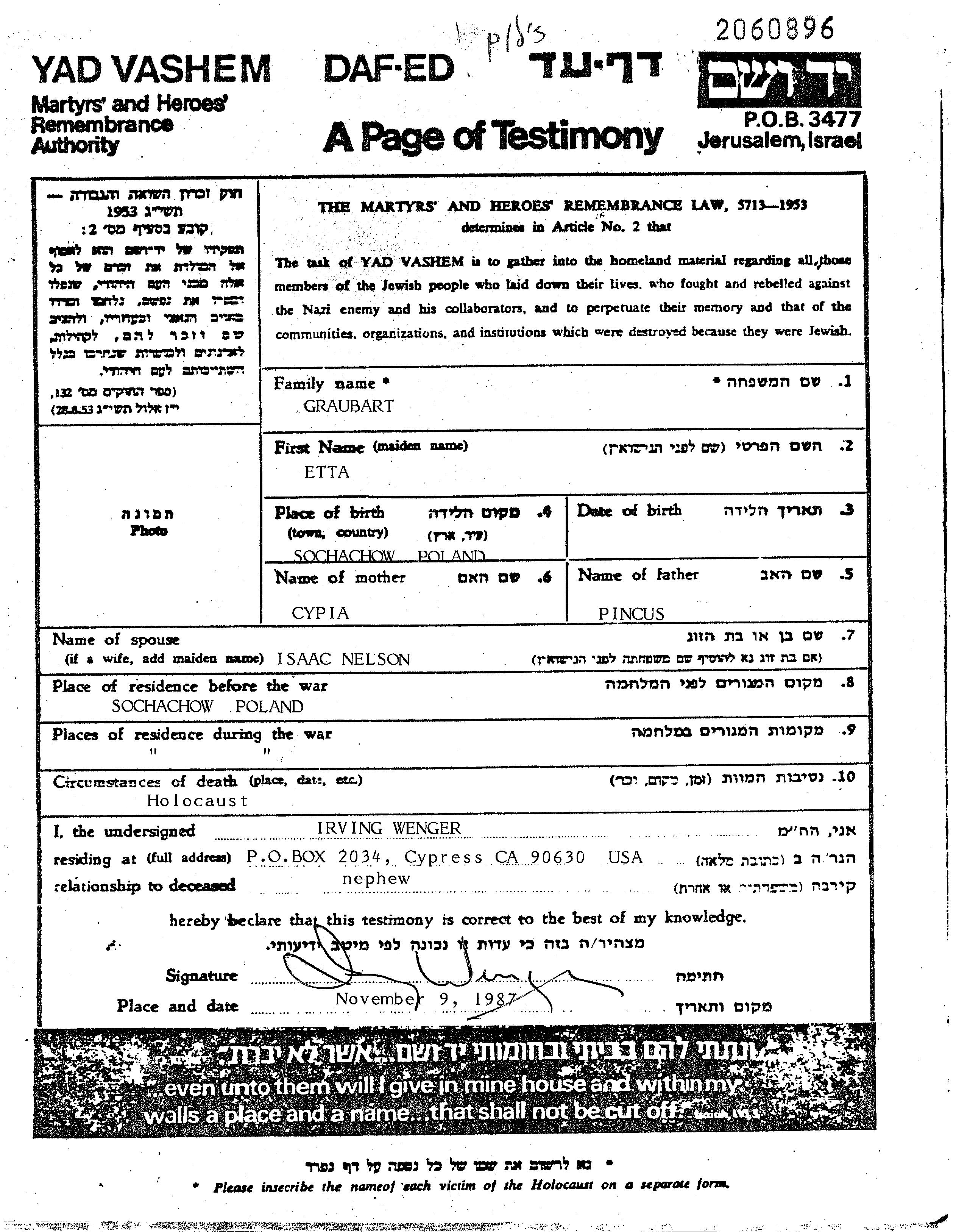 Etta Graubart Nelson, geb. Graubart wurde in Sochaczew, Polen geboren. Sie war die Tochter von Pincus und Cypia. Sie war mit Isaac Verheiratet. Vor dem Zweiten Weltkrieg lebte sie in Sochaczew, Polen. Während des Krieges war sie in Sochaczew, Polen.